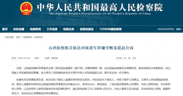 日前,山西省发展和改革委员会原二级巡视员庞建军(副厅级)涉嫌受贿罪一案,由山西省监察委员会调查终结,移送检察机关审查起诉。经山西省人民检察院指定管辖,由太原市人民检察院依法向太原市中级人民法院提起公诉。案件正在进一步办理中。