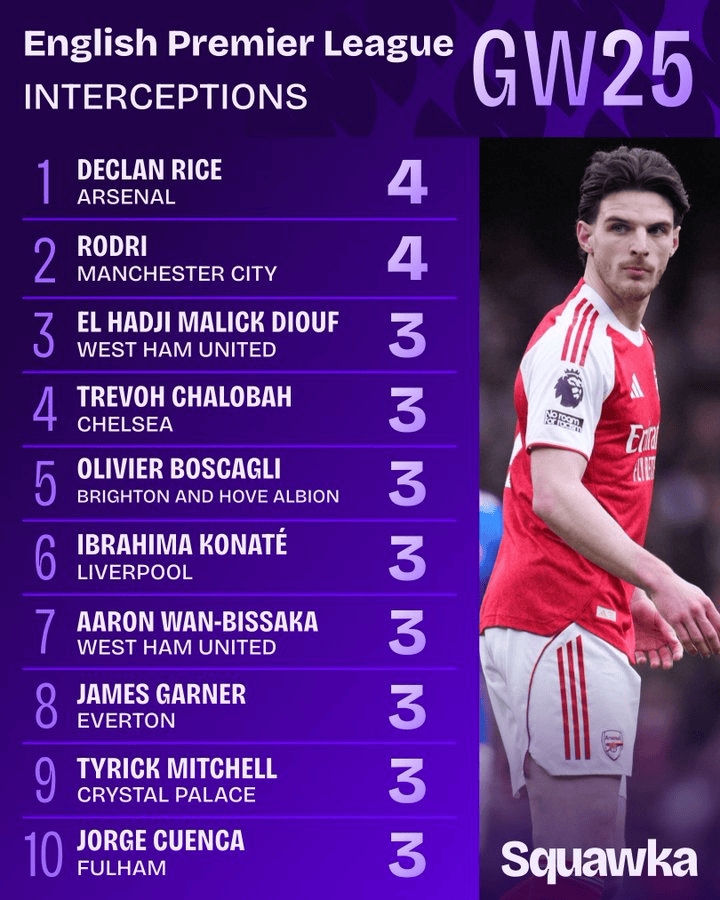 虎扑02月10日讯根据Squawka的统计,赖斯和罗德里是本轮英超联赛里拦截次数并列最多的球员,同为4次。