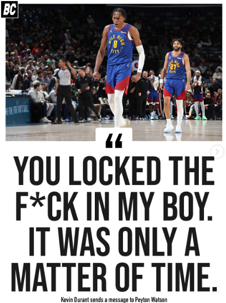 而后来,双方也确实维持了紧密的联系,当沃特森选择在大一结束后就参加NBA选秀时,杜兰特给他发来一条鼓励的短信。“我记得他当时说,‘我喜欢你的这份魄力’,”沃特森回忆道。而在今年1月份沃特森打出高光表现时,KD同样给予了赞美:“嘿,佩顿-沃特森,你tm彻底打疯了兄弟,这一切只是时间问题。”杜兰特在他的Instagram快拍中写道。
