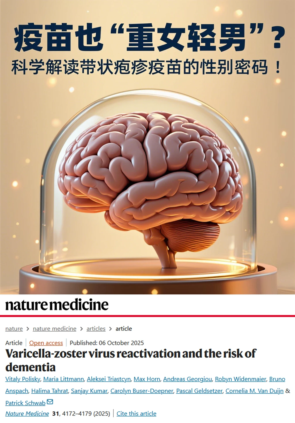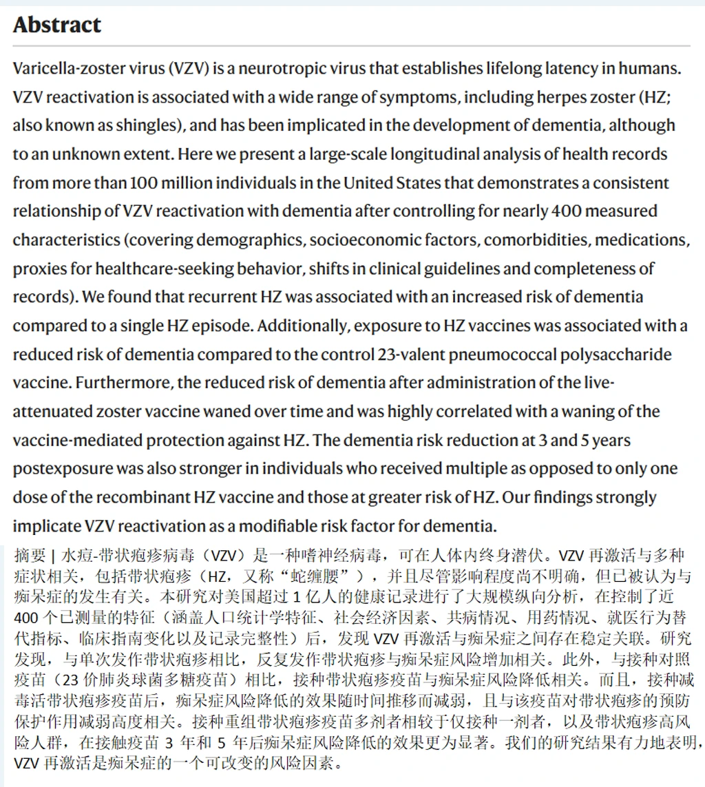 带状疱疹疫苗不仅是皮肤痛的“解药”,更可能成为女性守护记忆力的“秘密武器”。近日,《Nature Medicine》一项来自7千医院超1亿人数据的研究揭示:带状疱疹疫苗对痴呆风险的降低作用在女性中更显著。同样是接种疫苗,女性接种者的痴呆风险降幅比男性高出近一倍,这一发现让科学家重新审视病毒、性别与大脑健康的复杂关联。