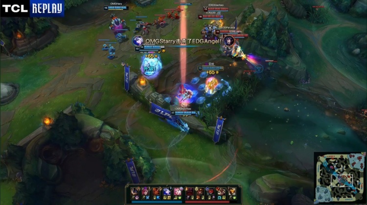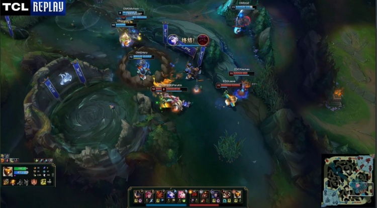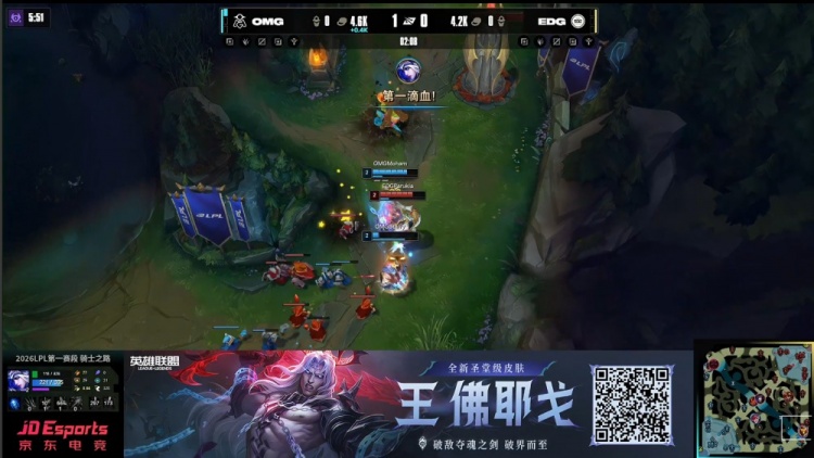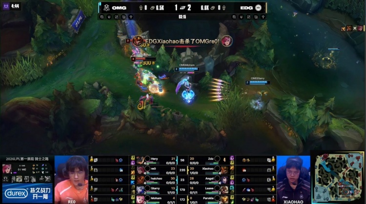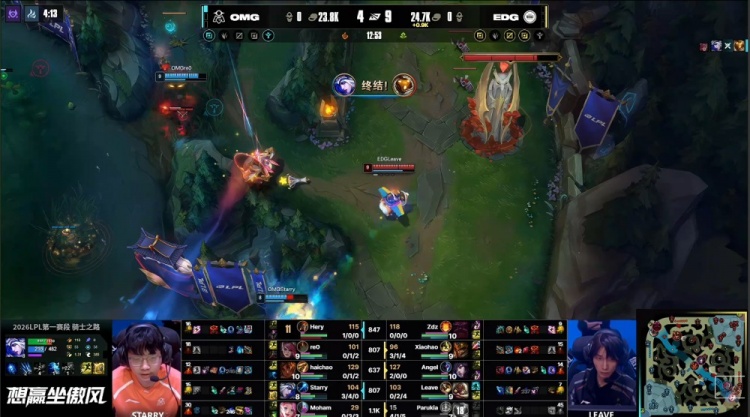 [8:32]OMG四人来下集火先杀Leave飞机,xiaohao皇子下路草丛EQ火锅扣住Starry,Parukia巴德再Q两人,OMG下路双人组再死一次,EDG打出0换2。