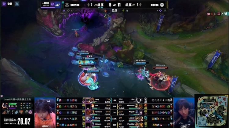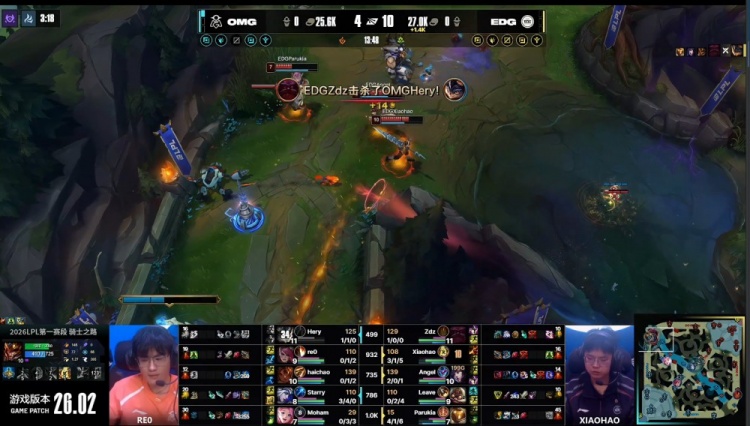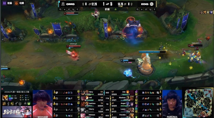[12:53]re0蔚下路反蹲,Parukia巴德开门被Starry艾希跟上吃掉终结人头。随后Parukia复活带队去上开门,Hery兰博瞬间被杀,EDG推掉OMG上路一塔,经济领先2k。