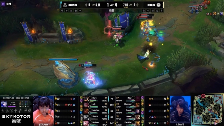[24:42]中路团战,Hery兰博完美大招开烧,但Leave飞机反手轰掉re0,xiaohao皇子EQ反手挑飞OMG双C击杀Starry艾希,EDG打出3换4推掉OMG中路一塔,经济落后1.8k。