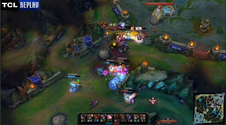 [36:16]EDG搏命开大龙,OMG姗姗来迟,但re0抢掉大龙,angel狐狸被hery兰博烤掉,Zdz奥恩也被Starry击杀,OMG轻松1换2,一波推平EDG基地拿到赛点。