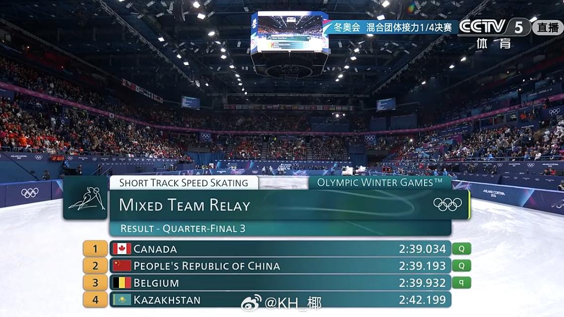 2026年米兰科尔蒂纳冬奥会 短道速滑男女混合接力预赛,中国队小组第二晋级下一轮!