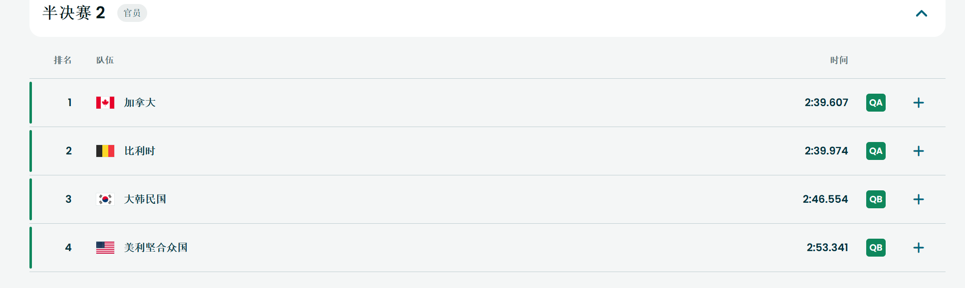 在第二组中,加拿大和比利时分列一二直接晋级,美国队选手摔倒带到韩国选手,最终通过裁判没有进一步判罚。