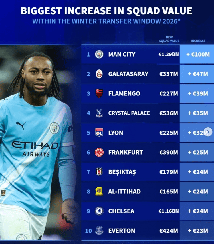 虎扑02月10日讯德国转会市场统计了今年冬窗过后,身价上涨最多的球队,详情如下: