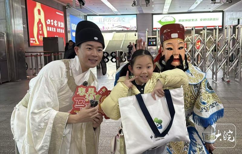 大皖新闻讯“如果让你向身边朋友推荐池州的三道美食,你会推荐哪三道?”“西山焦枣、池州小粑、茅坦酥糖!”“恭喜你答对了,请收下礼物,欢迎回家!”2月10日,池州高铁站出站口暖意融融,刚从外地返池的胡美玲一出站,就遇上了由COS“李白”的主持人与身着青阳腔、傩戏戏服的NPC组成的“接站天团”,接过饱含家乡温度的新春大礼包,她难掩欣喜:“一出站就感受到家乡人民浓郁的热情,还幸运领到了礼物,心里特别暖。”