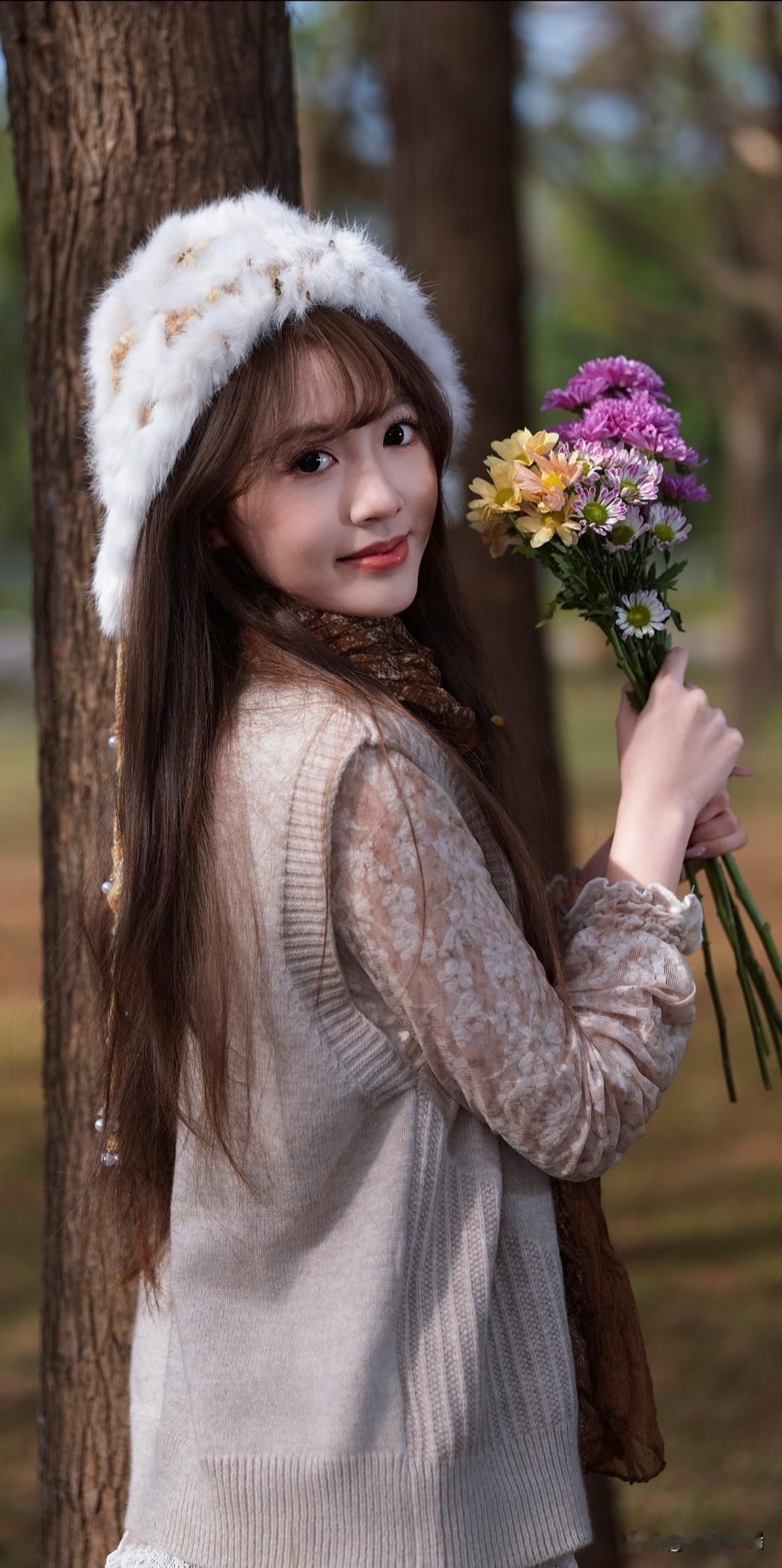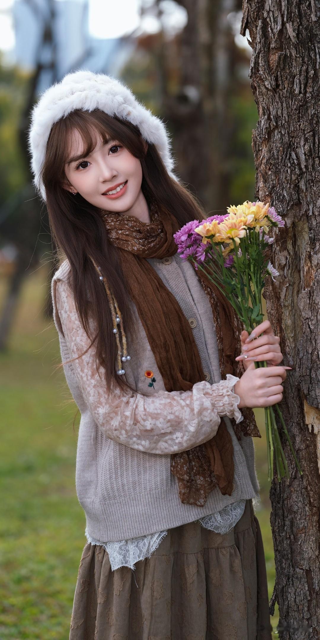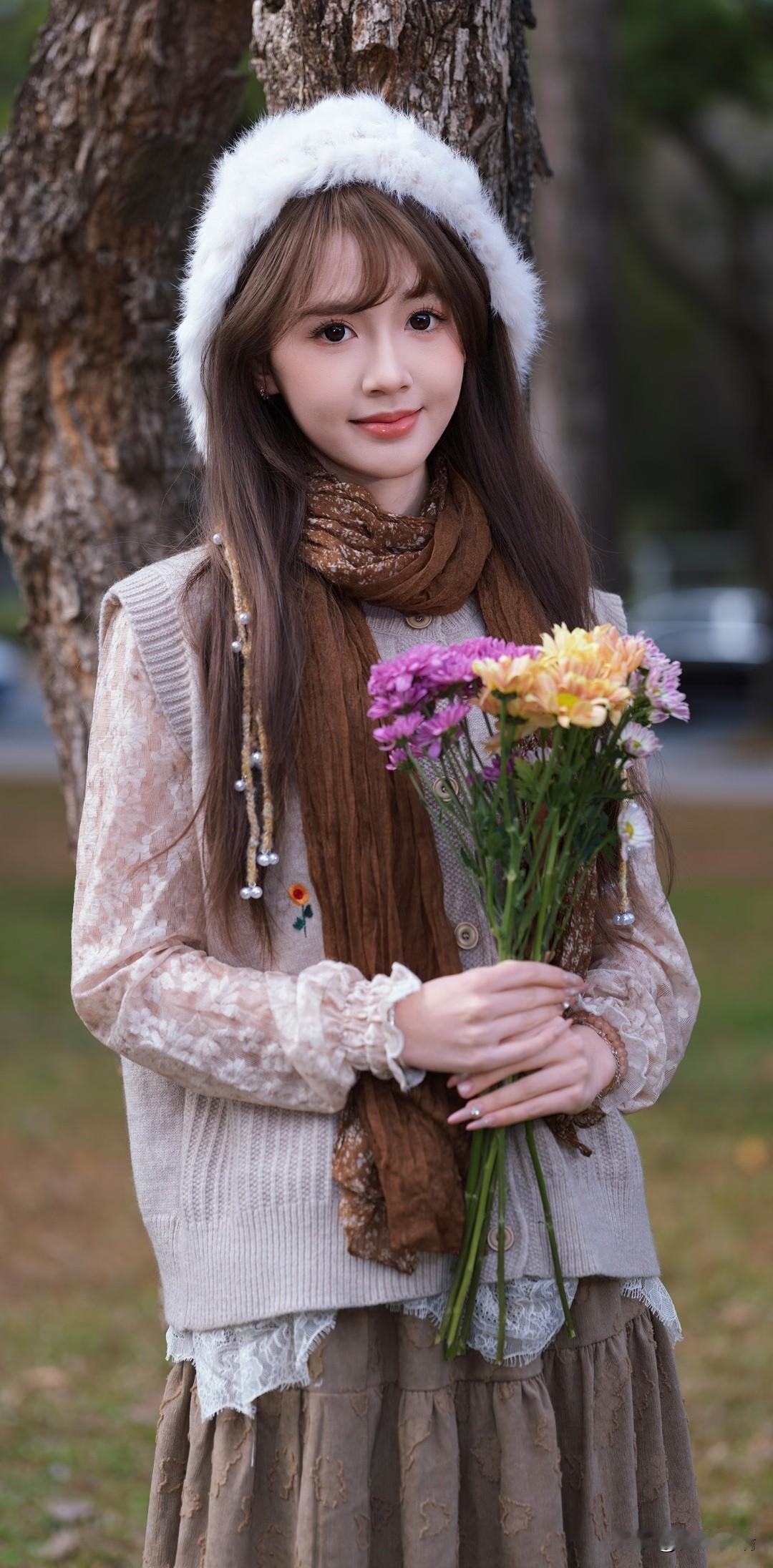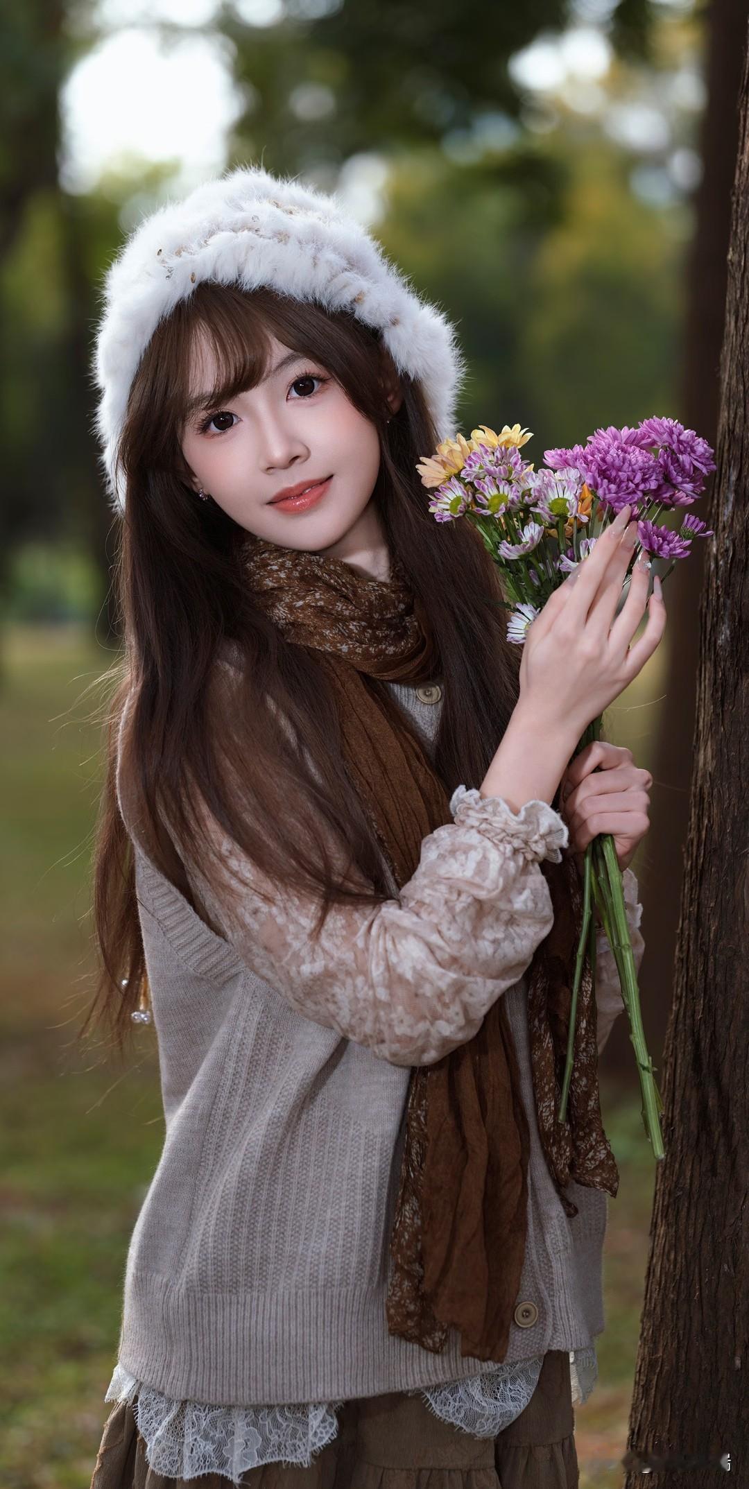冬日暖阳下,手持花束的少女,温暖而美好。