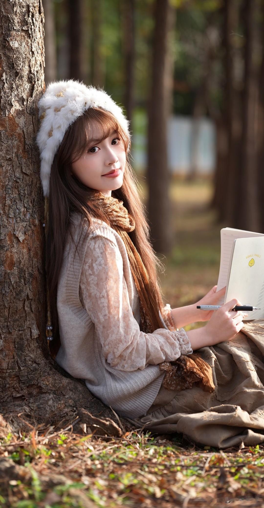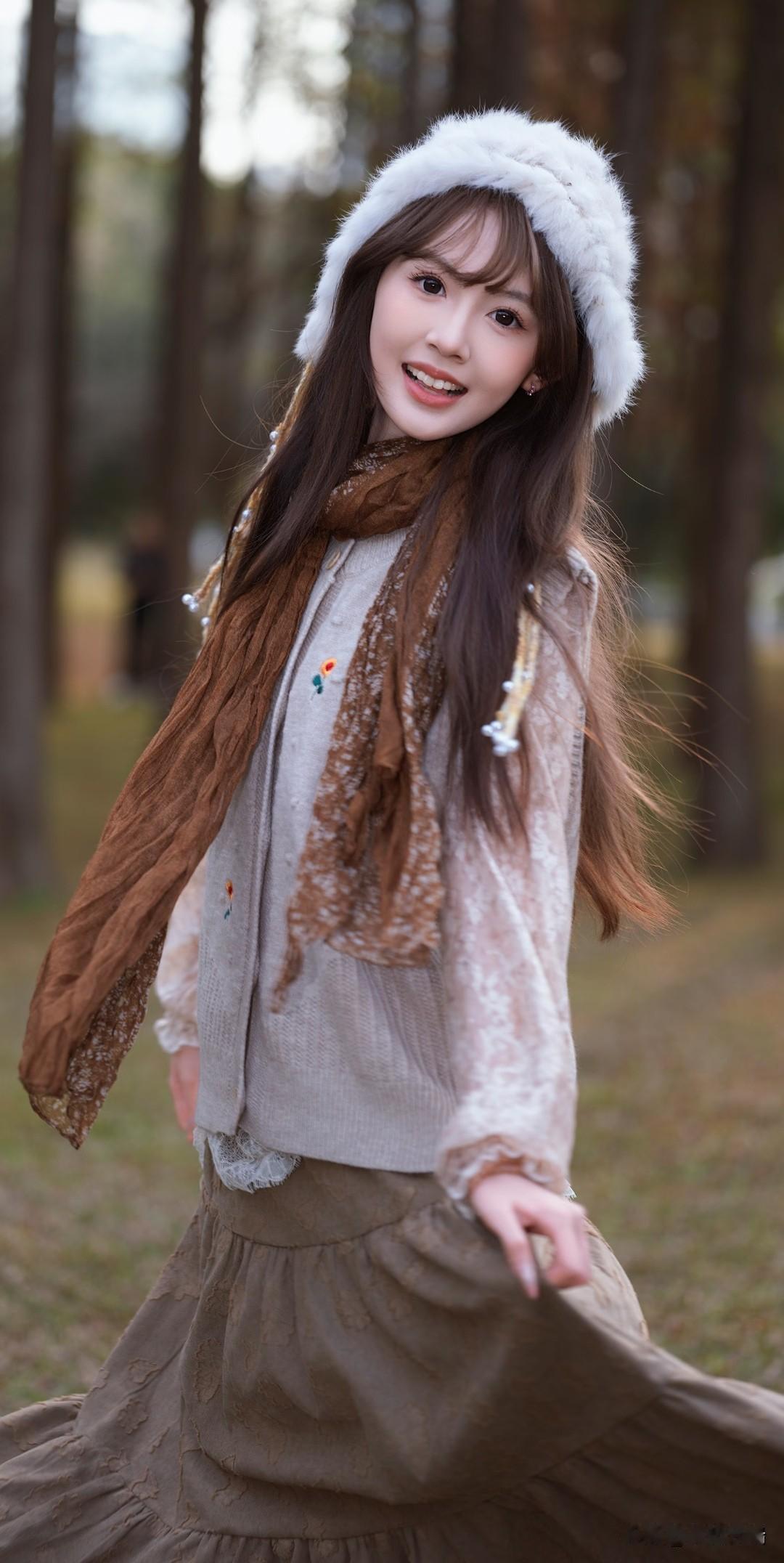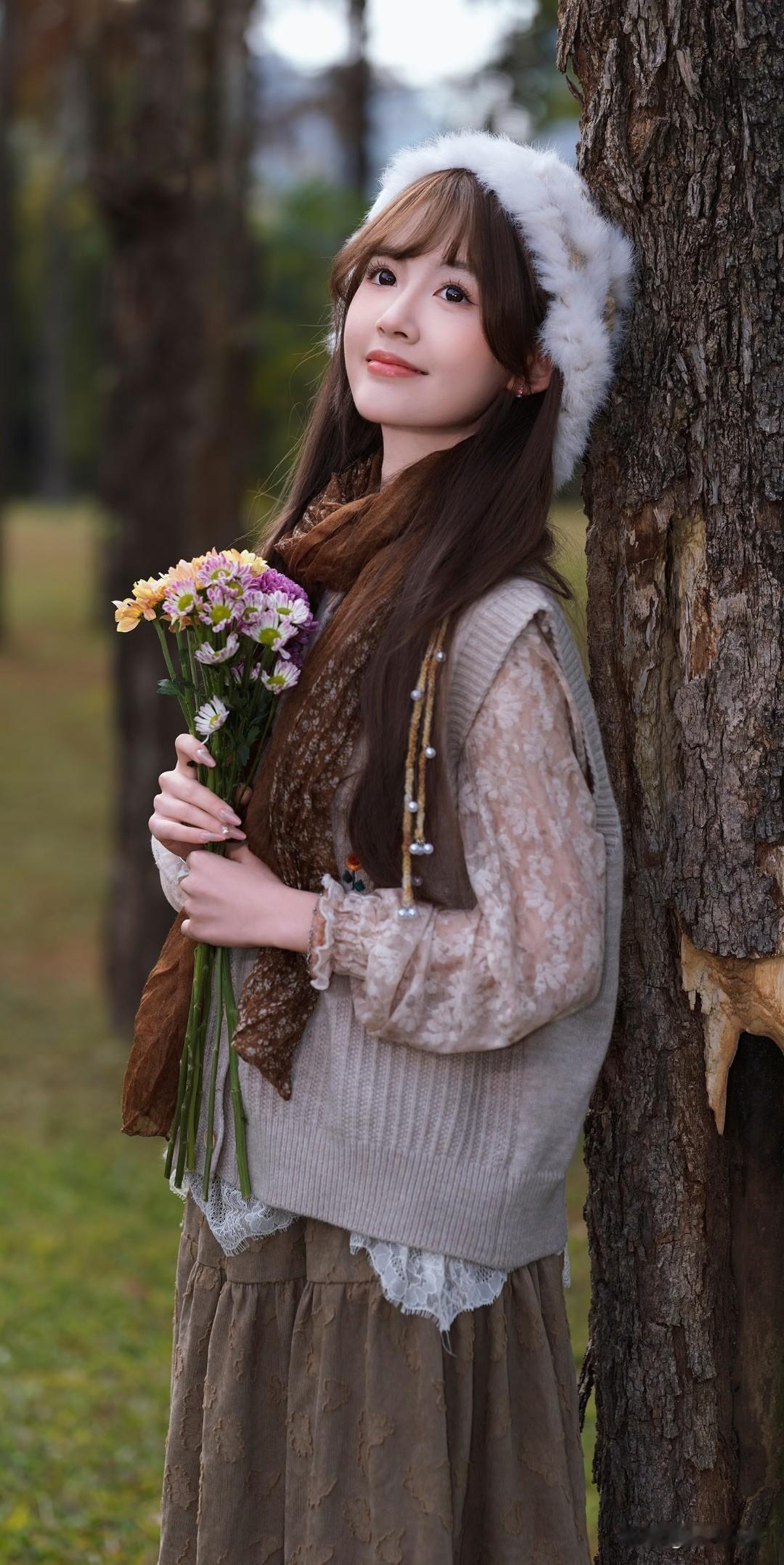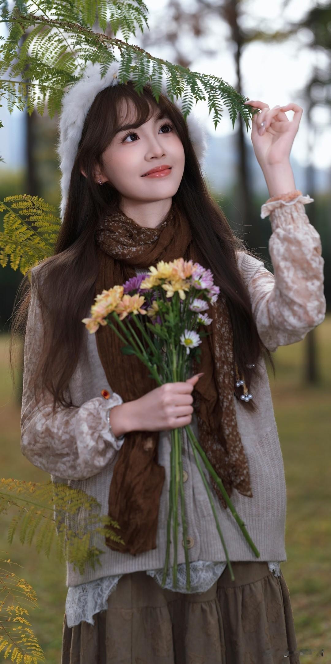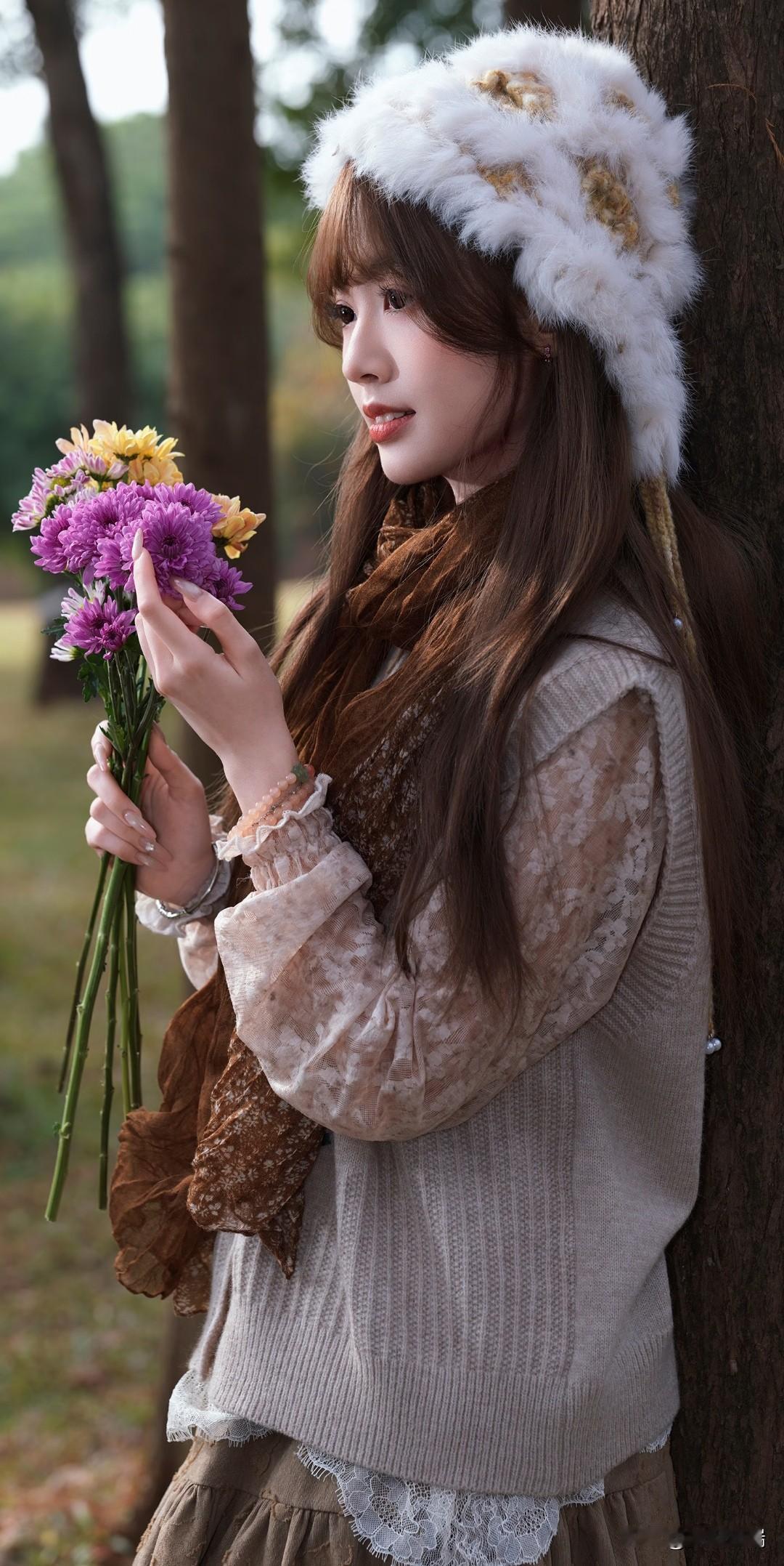 冬日暖阳下,手持花束的少女,温暖而美好。