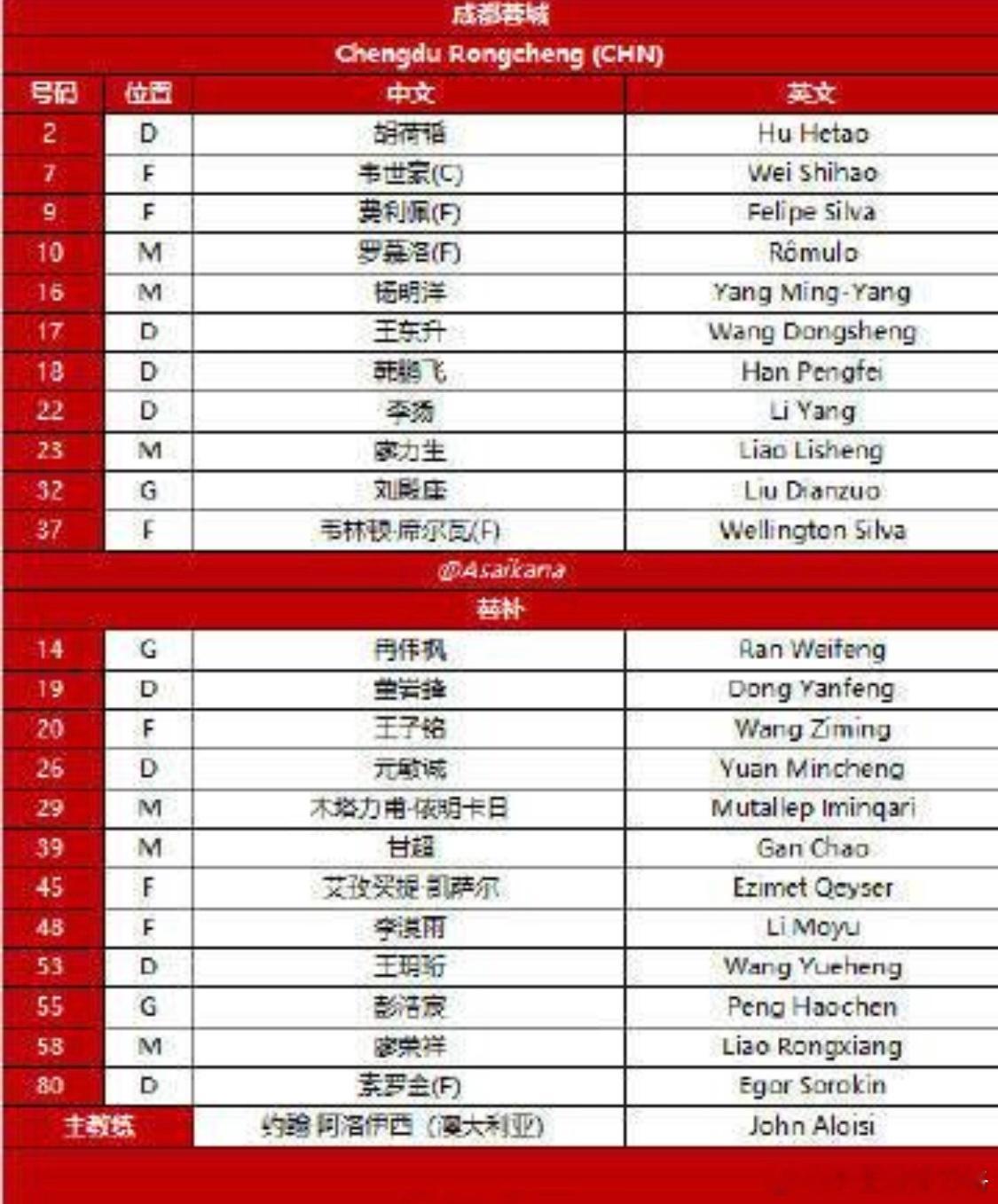 成都蓉城首发阵容:32-刘殿座、18-韩鹏飞、17-王东升、22-李扬、2-胡荷韬、23-廖力生、16-杨明洋、10-罗慕洛、37-席尔瓦、7-韦世豪、9-费利佩