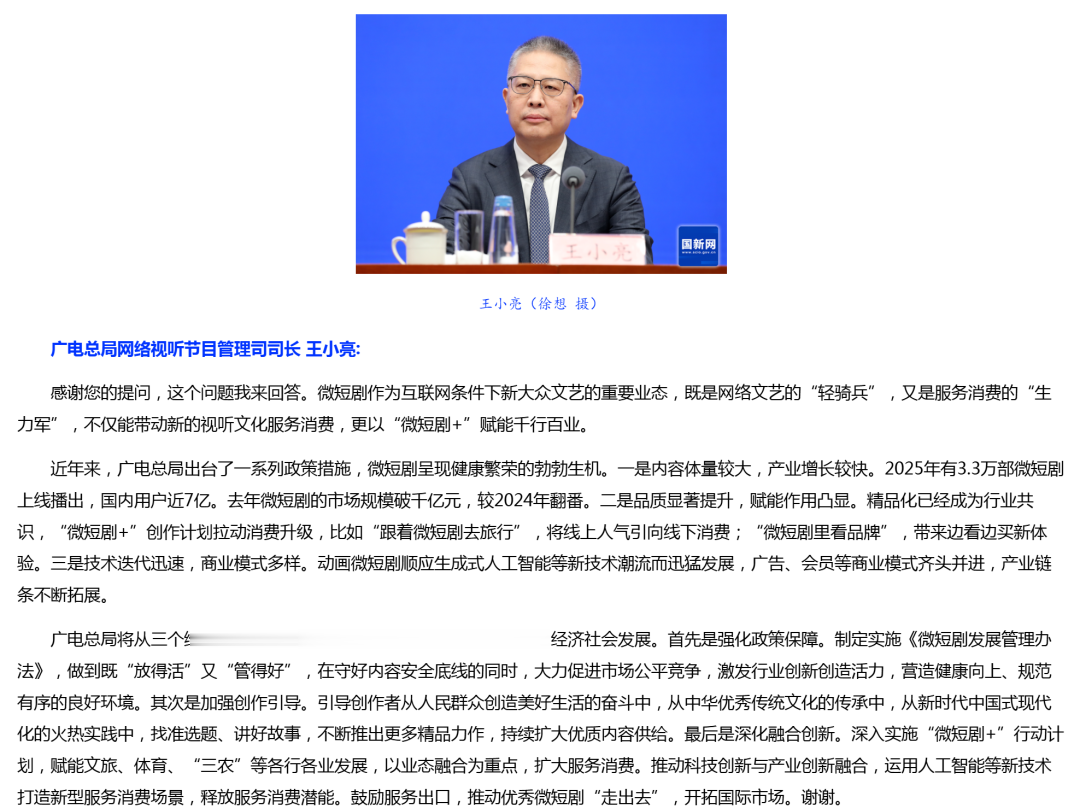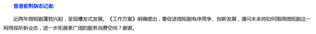 香港紫荆杂志记者提问指出:近两年微短剧蓬勃兴起,呈现爆发式发展。《工作方案》明确提出,要促进微短剧有序竞争、创新发展,请问未来将如何围绕微短剧这一网络视听新业态,进一步拓展更广阔的服务消费空间?