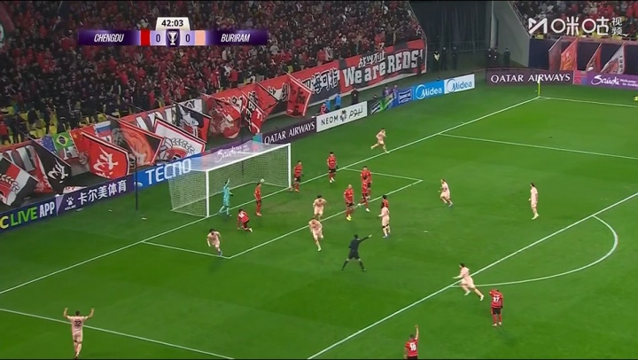 VAR介入!第42分钟,对手凭借定位球破门,蓉城0-1落后武里南联