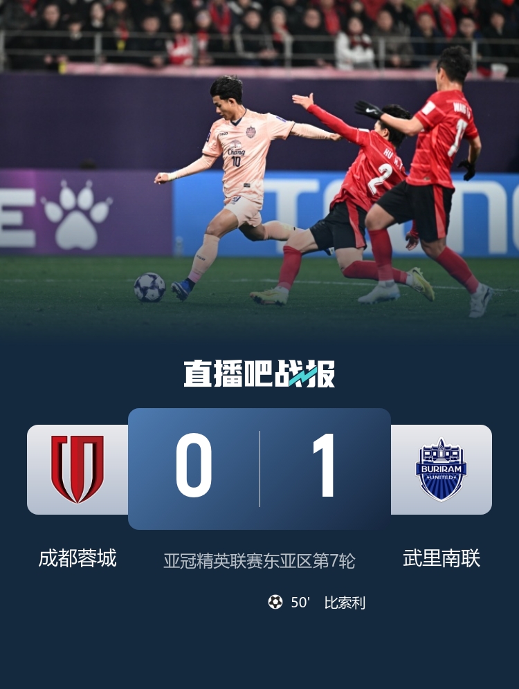 第50分钟,蓉城丢球,罗伯特·茹利角球开至禁区,武里南联一点头球攻门被挡,比索利爆射,站在门线的罗慕洛挡了一下仍无法阻挡皮球入网,蓉城0-1落后武里南联。↓