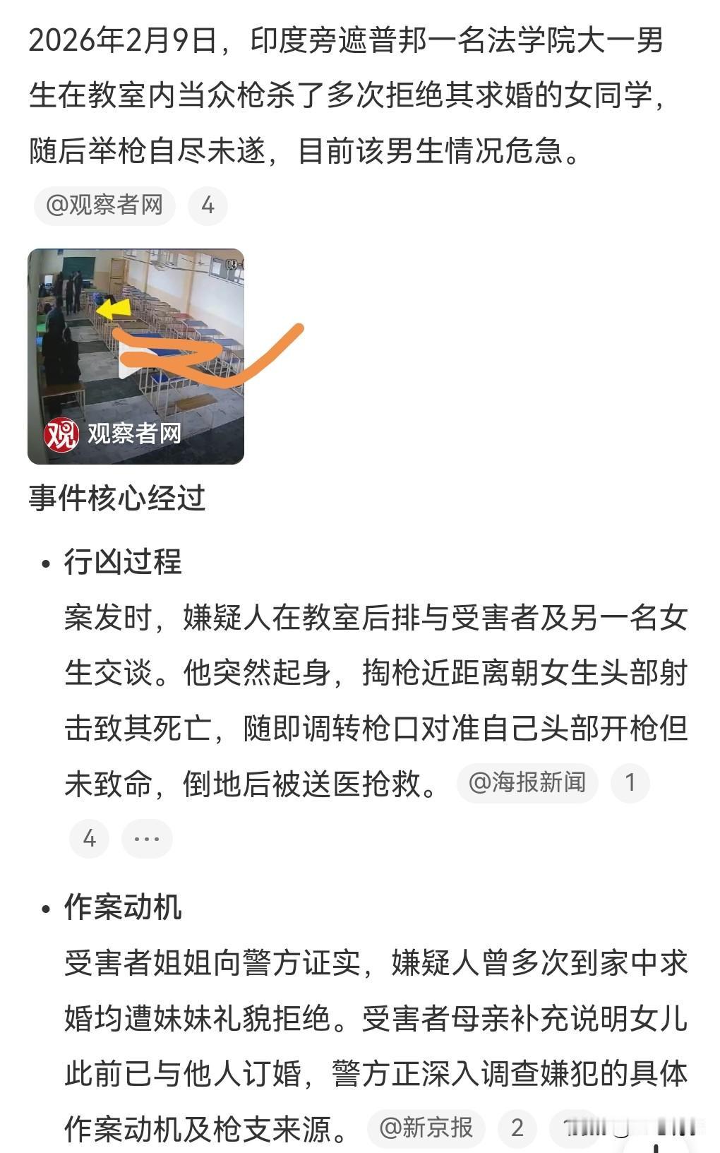 这真的是太极端了。2月9日,印度大一男生求婚遭拒将女生枪杀,将女生枪杀后,男子对自己扣动了扳机。 目前男子情况危急。 遇害者的姐姐表示,男子曾多次在家中向妹妹求婚,妹妹礼貌拒绝,因为妹妹已经和别人订婚了。 这名男子真的是太钻牛角尖了,别人不同意,你换个目标不就行了吗?天涯何处无芳草,看开一点,看远一点嘛。 正所谓双向奔赴的爱情才有意义啊。 这名男子实在是太疯狂了,哪怕是救活了,也一定要严惩这样的人,哪怕是救活了,也要判他死刑。 救他是出于道义,但这样的人必须执行死刑。 这种得不到就毁灭的男人实在是不少。
