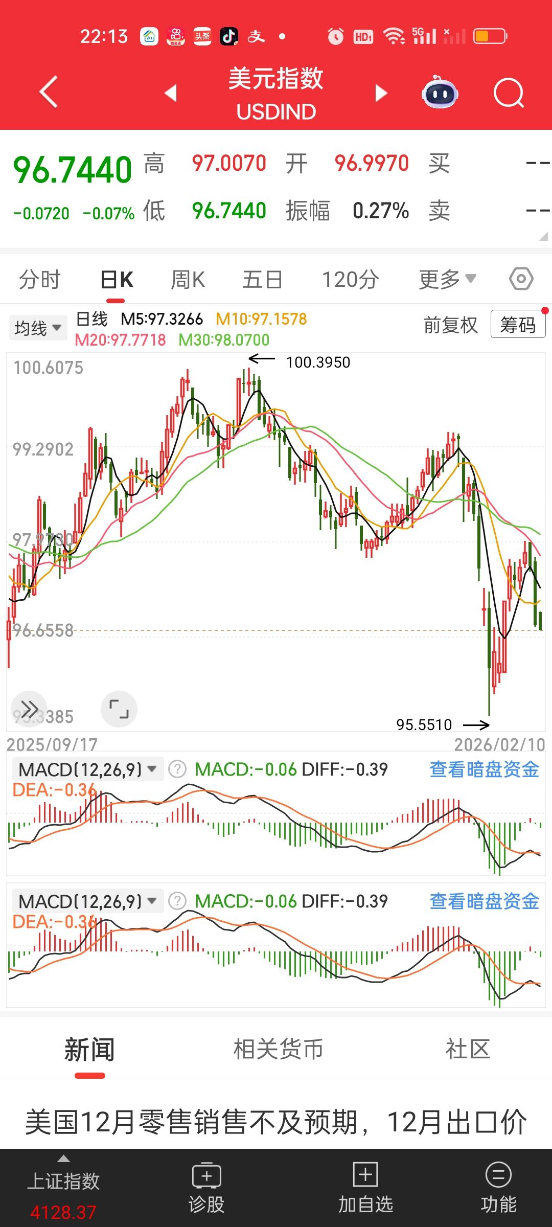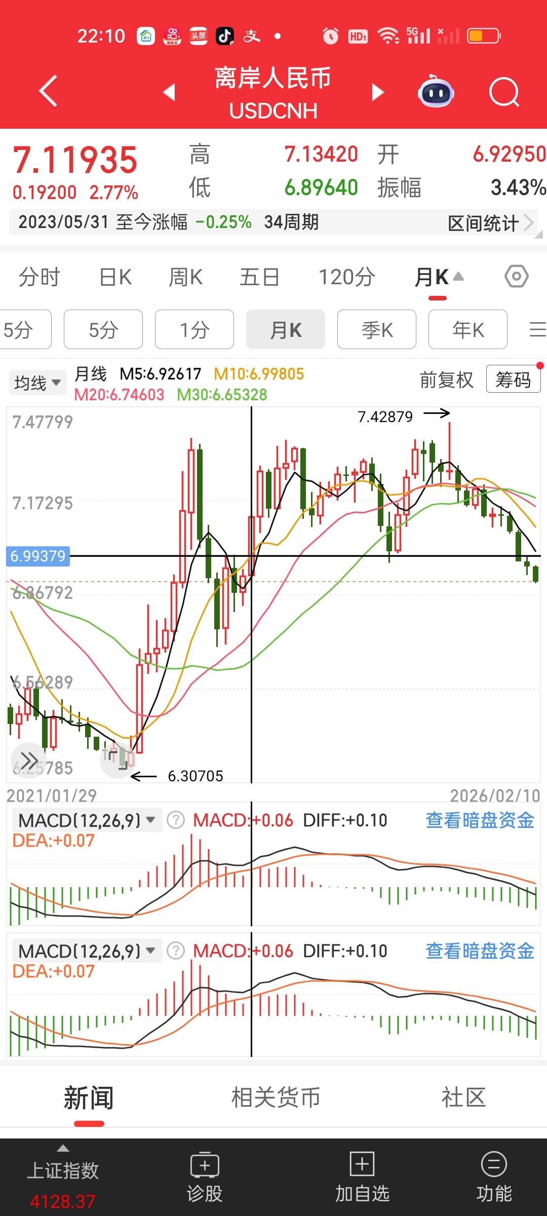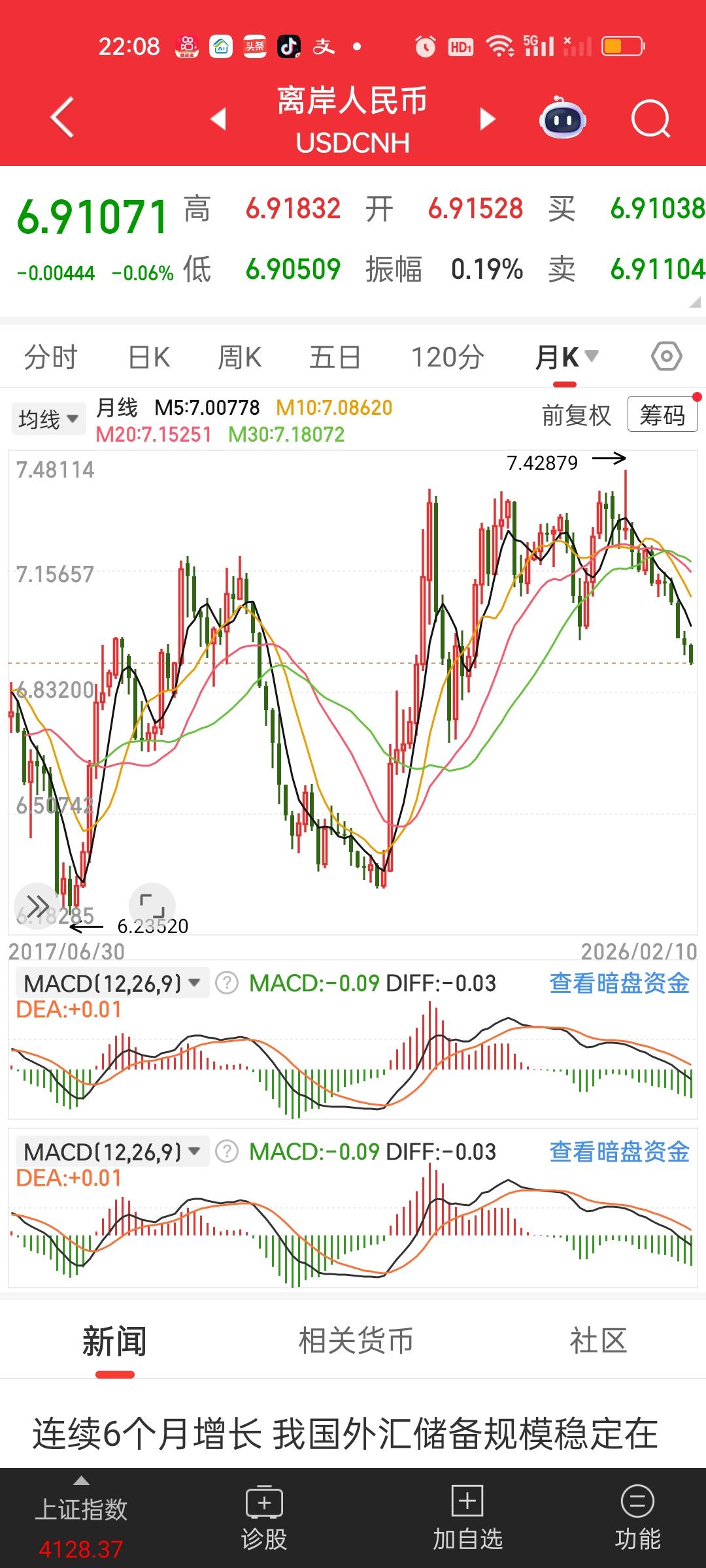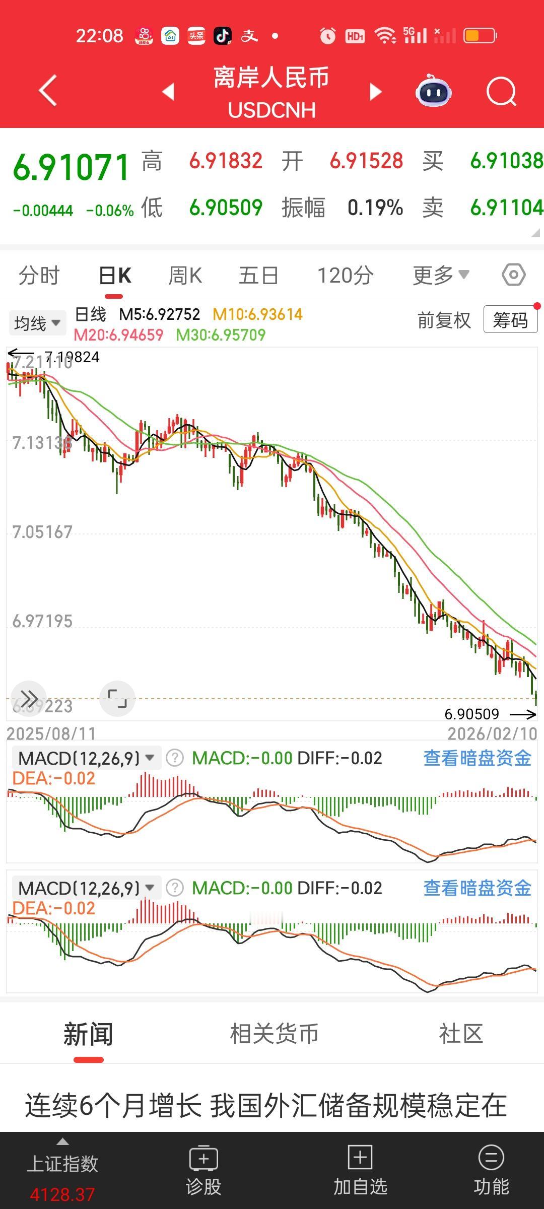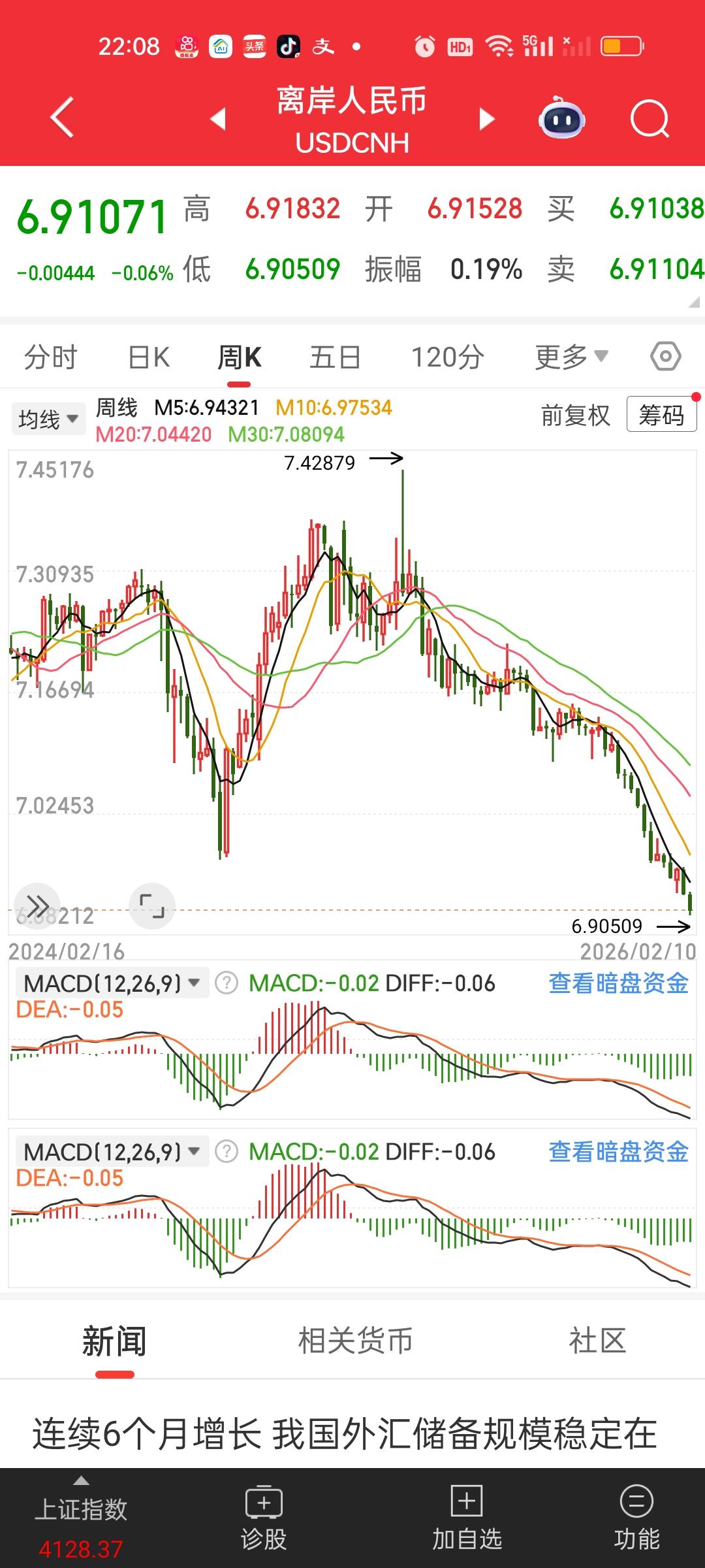 离岸人民币今天再次创出近3年来的新高。已经从7.42879升到了6.90509,6.90509/7.42879=0.92950,短时间内已经升值了7.05%。创出2023年5月份以来的新高,但很显然升值的势头并没有停止。可能会到6.50附近。但美元指数并没有破95.5510的前低。也就是说我们破三年来的新高而美元指数连前低都没有破,这就说明我们这次升值并不完全是被动升值。有我们主动升值的意图在里面。