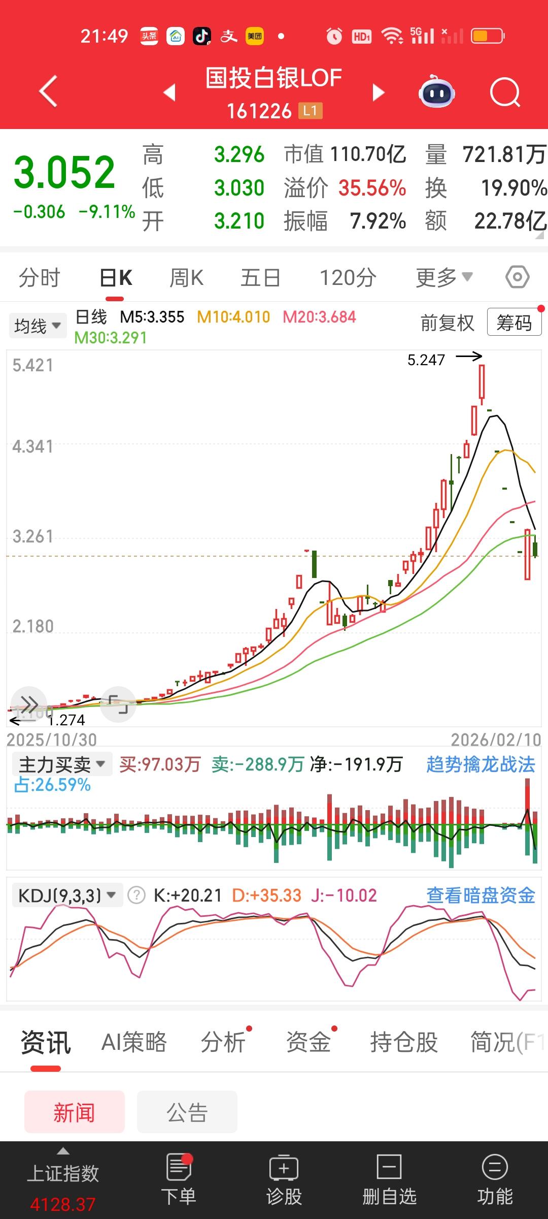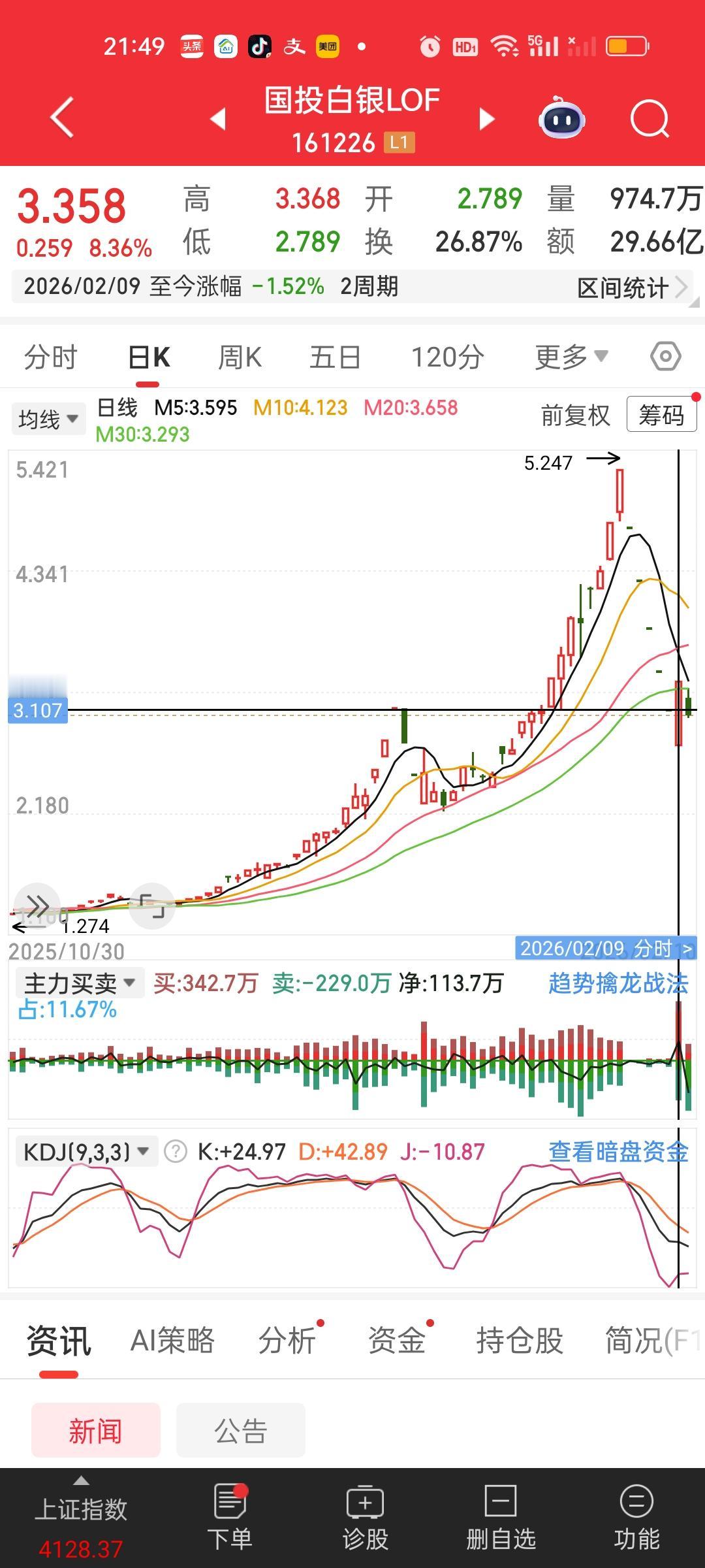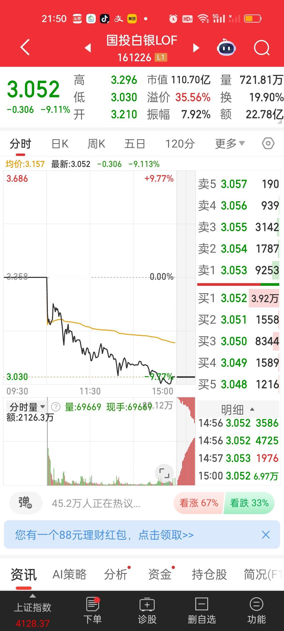 其实昨天国投瑞银白银ETF开盘就买进还是有很大利润的,跌停价2.789开盘,而且跌停价最少维持了一个小时时间。收盘涨8.36%,收盘收在了3.358。3.358/2.789=1.2040,早上跌停价买进,也可以吃20.40%,而今天几乎是平开的3.296/3.358=0.9815,也就低开1.85%。昨天20个点只要不贪心,几乎是可以全部吃到的。开盘就清仓,尾盘再接一半仓位回来,也是相当完美的操作。