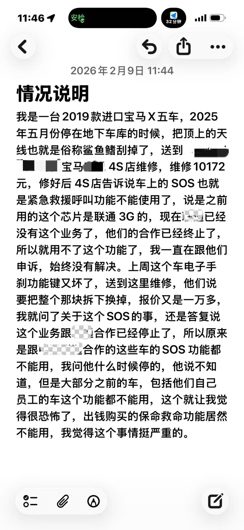 根据朱先生发来的情况说明,记者了解到,朱先生的座驾是一台2019款进口宝马X5。去年5月的某天,朱先生驾车驶入一处地下车库时不慎将“鲨鱼鳍”蹭掉,事后他报了保险并将车送至长沙河西一家宝马4S店维修,维修费为10172元。但修好后,该4S店维修师傅告诉朱先生,这台车的SOS功能不能再使用了,原因是这款车的“鲨鱼鳍”采用的是3G芯片,而与宝马合作的通信运营商逐步退出了3G基站,采用了4G、5G基站。