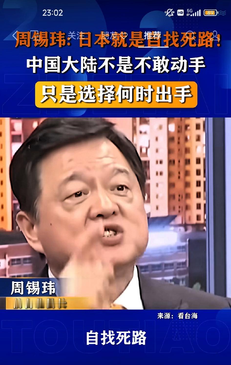 周锡玮:日本就是自寻死路!中国大陆不是不敢动手,只是选择何时动手! 我今天在讲日本,它就是自寻死路。我今天就跟你赌这个,你看大陆敢不敢动手。 我问各位,日本为什么一定要挑衅台湾问题,美国为什么一定要日本针对中国大陆挑衅这个问题? 中国人过去容忍,因为我打不过你,但是我现在可以了,那么我要决定什么时候动手那是我的策略。我会有我的策略,我会稳稳的走。