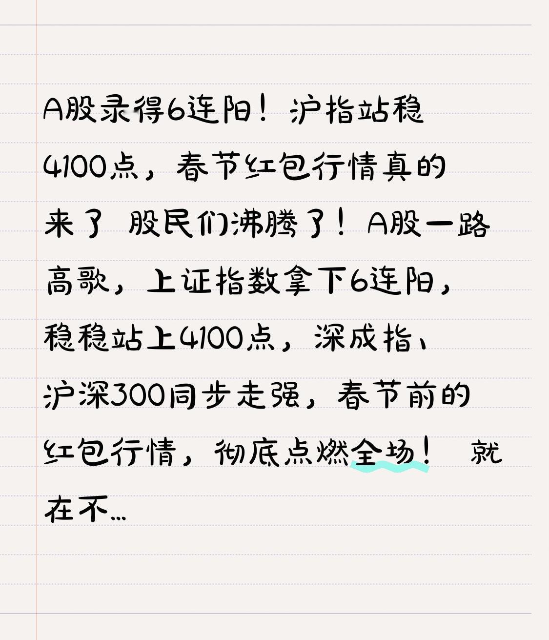 A股录得6连阳!沪指站稳4100点,春节红包行情真的来了 股民们沸腾了!A股一路高歌,上证指数拿下6连阳,稳稳站上4100点,深成指、沪深300同步走强,春节前的红包行情,彻底点燃全场! 就在不久前,市场还在震荡磨底,很多人割肉离场、不敢加仓,天天担心继续下跌。谁也没想到,短短几天行情彻底反转,指数连收阳线,成交量持续破万亿,北向资金大举扫货,机构资金频频入场,把悲观情绪一扫而空。 不少人懵了:明明刚割在底部,怎么行情就来了? 转折点来了:这波上涨不是偶然,而是三重利好共振!政策持续发力稳经济,消费、科技、传媒全线爆发;春节临近,节日消费、影视院线、AI应用掀起涨停潮;再加上资金面宽松,各路资金回流A股,推着指数一路走高。 但盘面藏着关键细节:指数连阳,个股却分化明显。有人赚得盆满钵满,有人满仓踏空,甚至还在亏钱。不是牛市来了人人都赚,而是结构性行情,选对方向吃肉,选错方向踏空。 为什么6连阳如此重要?它打破了前期低迷格局,修复了市场信心,更是给散户送出春节前的定心丸。历史数据显示,春节前连续走强,节后大概率延续行情,持股过节成了多数人的共识。 很多散户纠结:现在追高怕被套,不追怕踏空。其实不用慌,行情走的是稳涨路线,缩量震荡是健康蓄势,主力在高低切换,重点拥抱政策支持、业绩确定、资金抱团的方向,远离纯炒作、无业绩的垃圾股。 这波6连阳,不只是数字上涨,更是经济回暖、市场信心回归的信号。我们盼了太久的稳行情,终于在马年春节前落地。不管是老股民还是新股民,都感受到市场的暖意。 股市如人生,低谷时不放弃,上涨时不贪婪。守住理性,选对赛道,耐心持有,才能接住这波春节红包。 愿所有股民:账户长红,春节快乐,马年行大运!你持股过节还是持币过节?评论区聊聊!