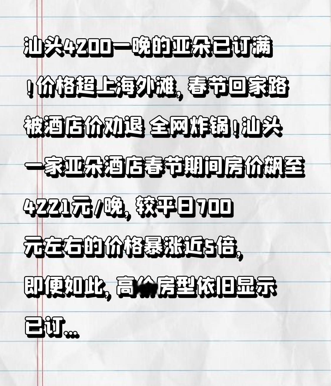 汕头4200一晚的亚朵已订满!价格超上海外滩,春节回家路被酒店价劝退 全网炸锅!汕头一家亚朵酒店春节期间房价飙至4221元/晚,较平日700元左右的价格暴涨近5倍,即便如此,高价房型依旧显示已订满,不少网友直呼:吃得起潮汕美食,住不起连锁酒店! 谁能想到,这座以平价烟火气出圈的粤东小城,酒店价格竟直接赶超上海外滩。平日里性价比拉满的中端连锁,春节摇身一变成“轻奢价”,如家、汉庭等经济型酒店也直奔千元,个别景区酒店甚至突破6000元,让返乡侨胞、慕名游客直呼吃不消。 本以为是商家恶意哄抬价格,转折点来了:这波暴涨背后,是多重需求集中爆发的供需失衡。2026年春节9天超长假期,叠加汕汕高铁全线开通,海外侨胞、外出乡贤扎堆返乡,游客冲着潮汕年味、英歌舞、内海湾烟花秀蜂拥而至,汕头酒店预订量同比暴涨186%。 可汕头市区仅2.5万间客房,面对单日超十万的客流,核心地段、热门时段房源直接供不应求,房价水涨船高也就成了现实。一边是游子一年一次的团圆期盼,一边是一房难求的无奈现实,即便价格离谱,也有人为了回家、为了过年不得不买单。 面对争议,汕头监管部门紧急出手,发布价格告诫书,约谈酒店要求合理定价,严禁哄抬价格、价格欺诈。但酒店价格属市场调节,即便监管介入,短时间内也难以缓解房源紧张的局面。 大家愤怒的从不是春节合理涨价,而是涨幅太夸张、中端酒店卖出高端价,让原本温暖的团圆年,多了几分被价格裹挟的无奈。我们爱上汕头,是因为街头巷尾的牛肉丸、粿条汤,是原汁原味的潮汕年味,是亲民又温暖的小城烟火气,而非动辄四五千的天价酒店。 一座城市的文旅热度,靠的是口碑留客,而非短期溢价收割。热度能带来一时流量,合理的价格、贴心的服务,才能留住长久人心。别让天价酒店,凉了游子的心,劝退了慕名的游客。 希望明年春节,汕头依旧火爆,房价回归理性,让每个人都能轻松奔赴这场潮汕年味之约,不用再为住宿发愁,安心享受团圆与美食。你能接受春节酒店翻几倍涨价?评论区聊聊!