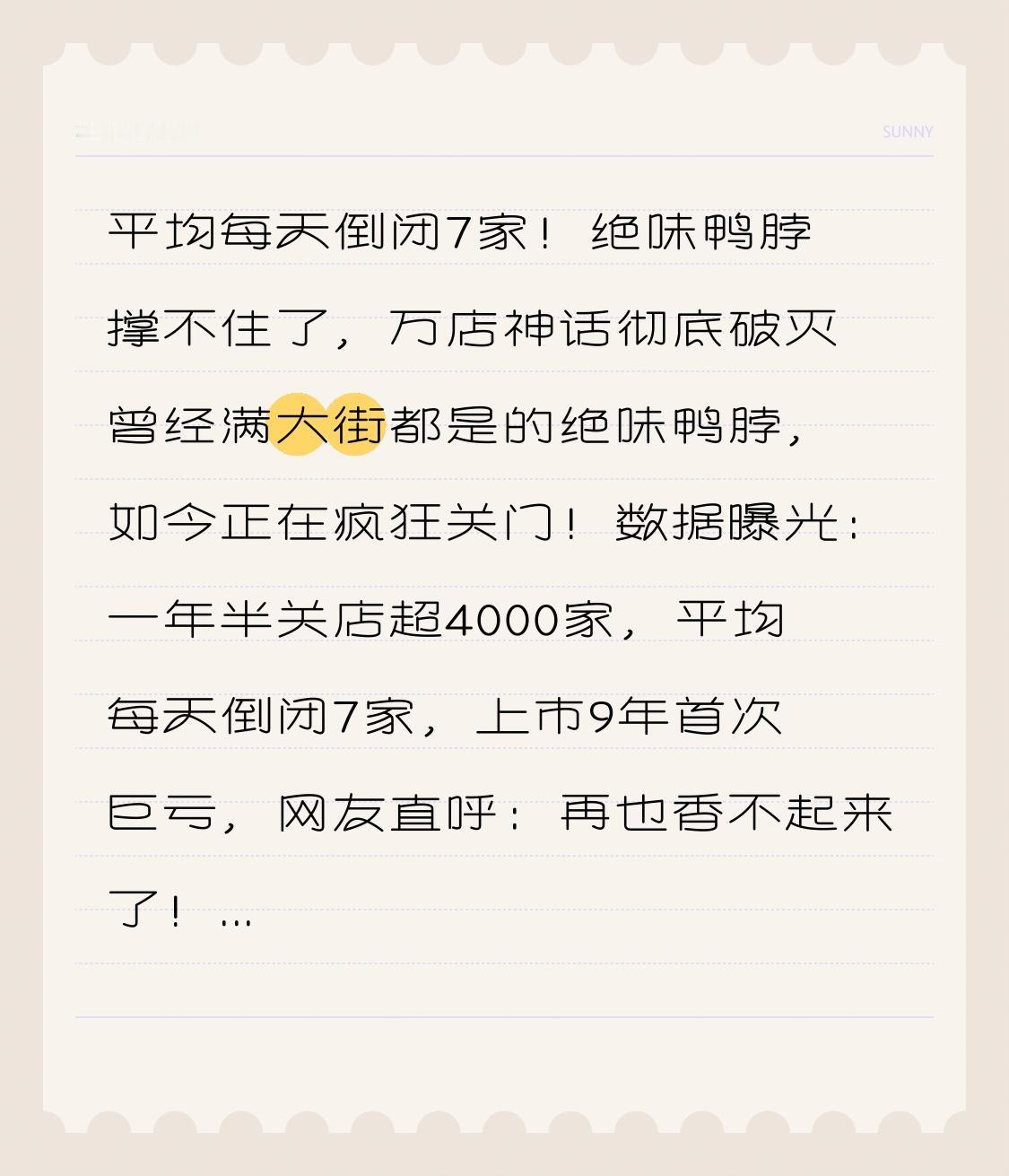 平均每天倒闭7家!绝味鸭脖撑不住了,万店神话彻底破灭 曾经满大街都是的绝味鸭脖,如今正在疯狂关门!数据曝光:一年半关店超4000家,平均每天倒闭7家,上市9年首次巨亏,网友直呼:再也香不起来了! 谁还记得,绝味靠着加盟扩张,巅峰时期近1.6万家店,号称“卤味界万店之王”,走哪都能看见它的招牌,追剧、夜宵、小聚,来一袋鸭脖是标配。可谁也没料到,曾经的国民小吃,会跌得这么惨。 很多人以为是疫情后遗症,真相却没那么简单。表面看,是价格太贵、口味变差、品控拉胯:随便称一点就要三四十,素菜比肉还贵,频繁被投诉变质、异物,消费者用脚投票,再也不买单。 深层看,是野蛮加盟的反噬!为冲规模疯狂开店,一条街挤好几家,加盟商互相抢生意,租金、人工涨不停,赚的钱全交了房租和加盟费,最后只能关门转让。更致命的是,投资亏损、违规被罚,多重打击下,2025年单季狂亏近5亿,直接戴上ST帽子。 本以为同行都不好过,转折点来了:周黑鸭关店优化逆势盈利,煌上煌聚焦性价比利润大涨,只有绝味,在盲目扩张里越陷越深。同样是卤味,别人在做品质、做精细,绝味还在拼数量、赚快钱,不淘汰你淘汰谁? 这不是绝味一家的危机,而是整个餐饮行业的警钟:靠铺店数、割加盟商的时代彻底结束了。消费者越来越理性,不好吃、不实惠、不放心,再大的品牌也会被抛弃。 我们怀念的,是当年平价又解馋的鸭脖;失望的,是如今店大欺客、只重规模不重口碑的巨头。一家店倒下去,背后是一个家庭的心血,是无数加盟商的眼泪。 绝味的故事告诉我们:不管品牌多大,不忘初心,守住品质,对得起消费者,才能走得长远。只想着赚快钱、割韭菜,再辉煌的神话,也会一夜崩塌。 你多久没买绝味了?觉得它还能东山再起吗?评论区聊聊!