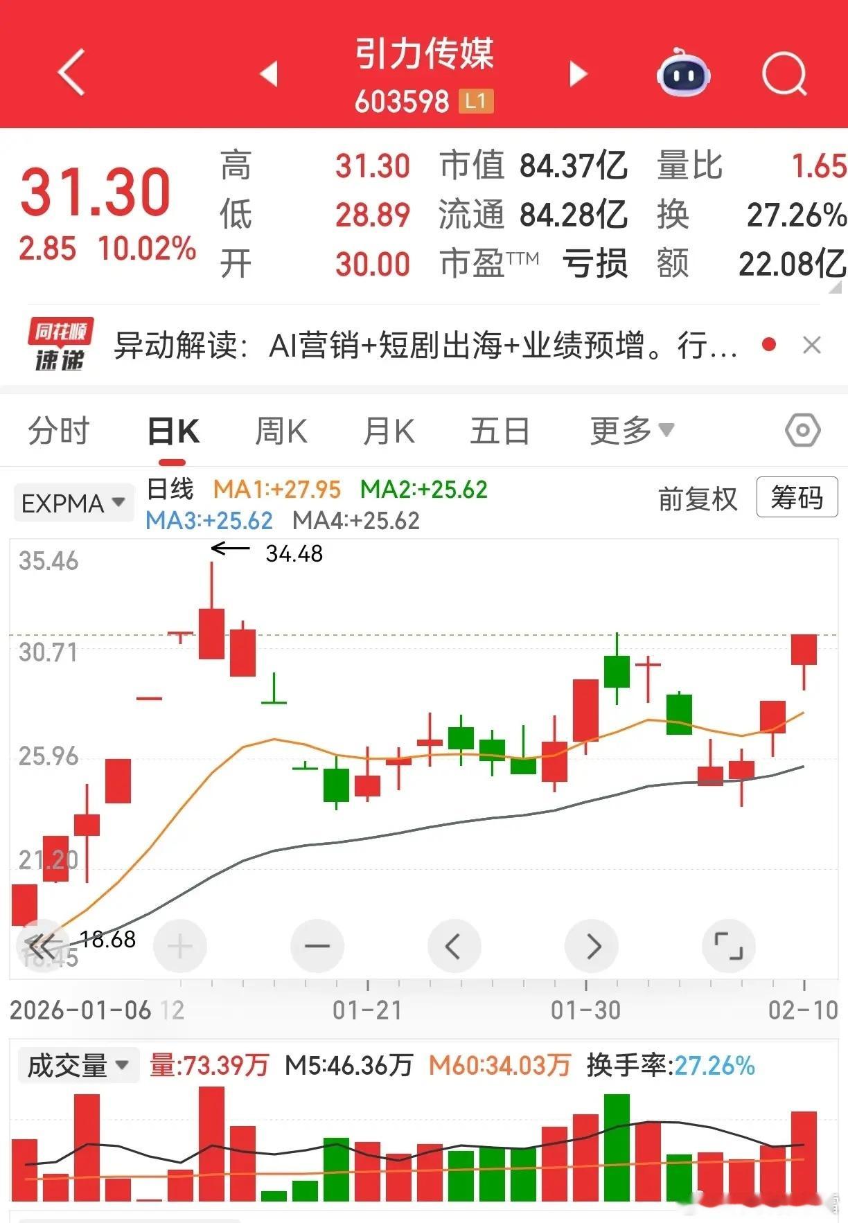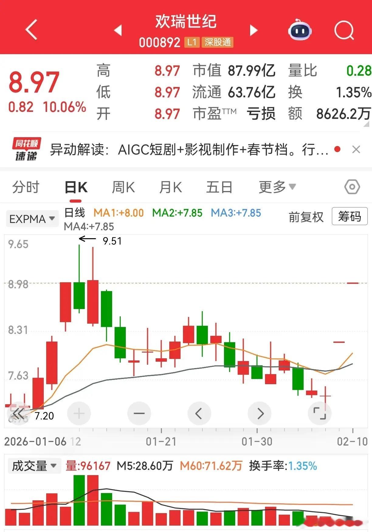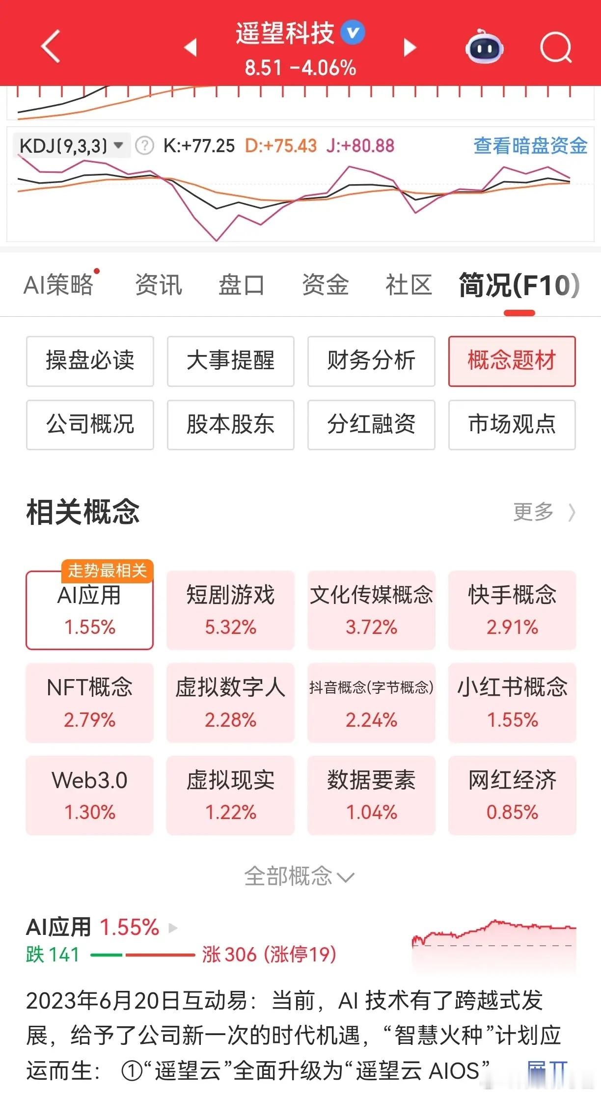 我也布局了这个方向,选了遥望科技,概念齐全:AI应用、短剧游戏、文化传媒全都沾边,今天却调整下跌,属实有点“满仓概念,踏空行情”,幽默自嘲一下,不影响整体板块热度。