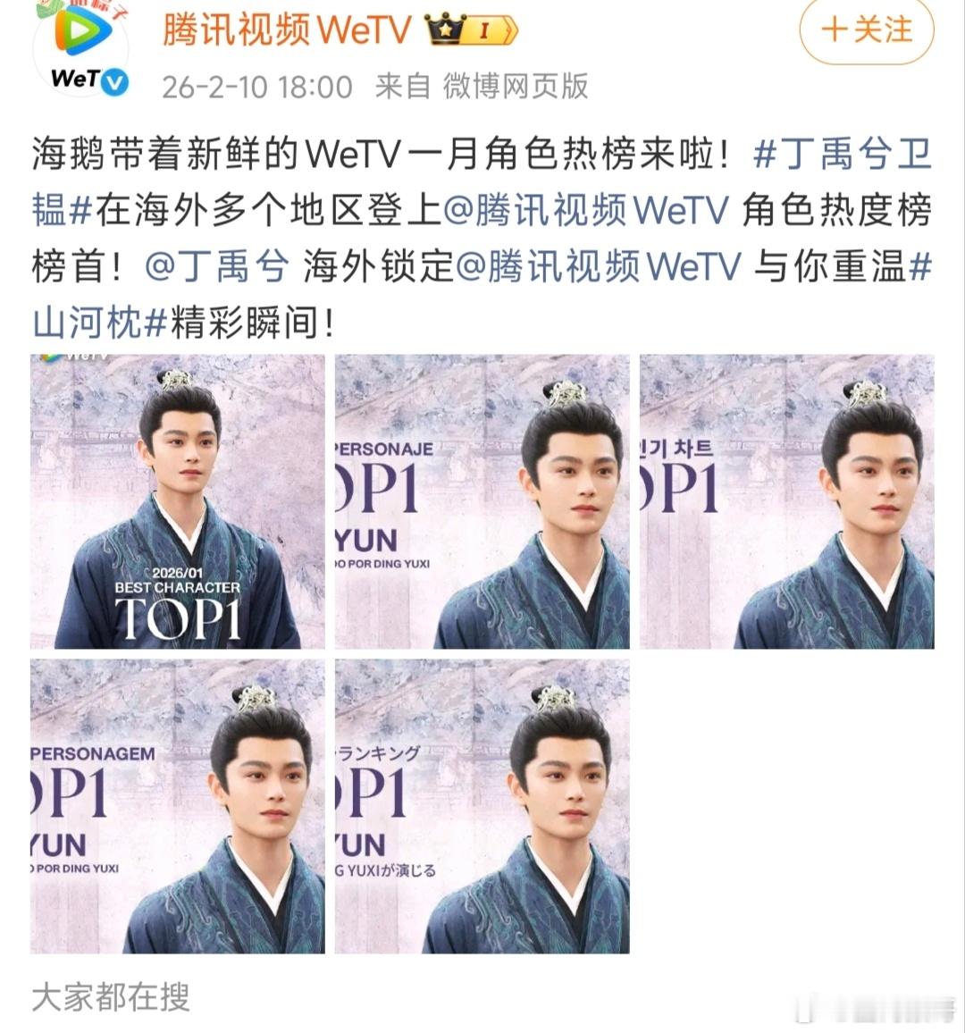 丁禹兮在山河枕里的卫韫拿到了WeTV海外多个地区的角色热度榜top1,虽然戏份少但不影响小丁🔥呀,有效播出+有效吸粉!