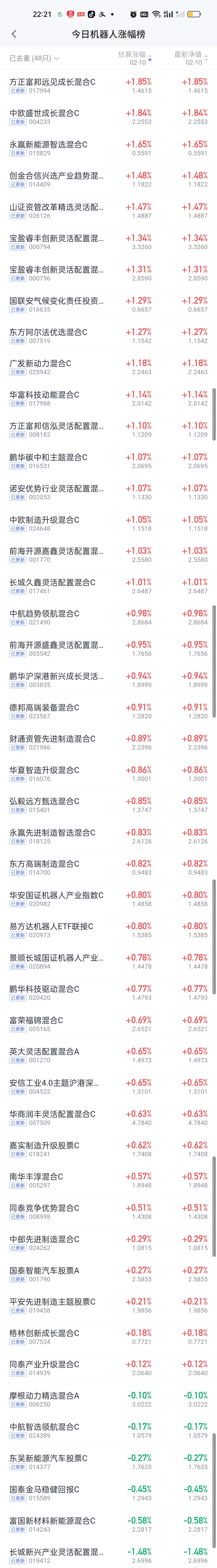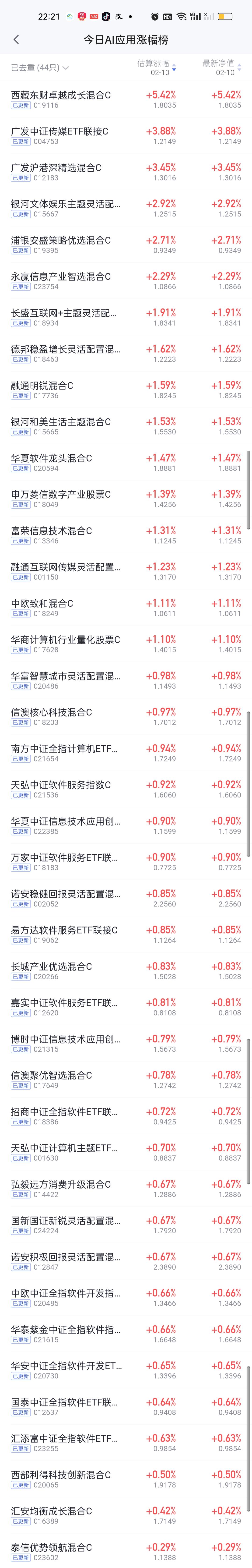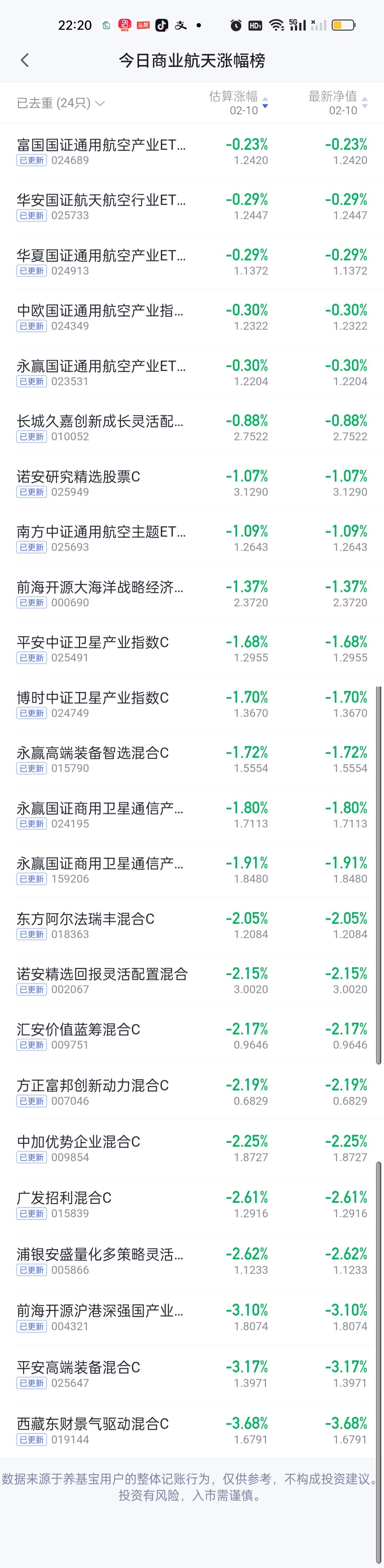 今日基金净值榜已全部更新完毕,自从估值看不到以后,就没有更新过每天的净值榜和板块榜了。今天开始继续更新! 涨幅榜方面,招商体育文化休闲股票5.64%排名第一,西藏东财卓越成长5.42%排名第二,华夏中证动漫游戏ETF联接4.96%排名第三,国泰中证动漫游戏ETF联接4.93%排名第四,鹏华文化传媒娱乐股票4.58%排名第五。 跌幅榜方面,西藏东财景气驱动3.68%排名第一,浙商汇金鼎盈事件驱动3.21%排名第二,平安高端装备3.17%排名第三,前海开源沪港深强国产业3.10%排名第四,中邮能源革新2.98%排名第五。 商业航天,AI应用,CPO,机器人,创新药涨幅榜一并奉上!