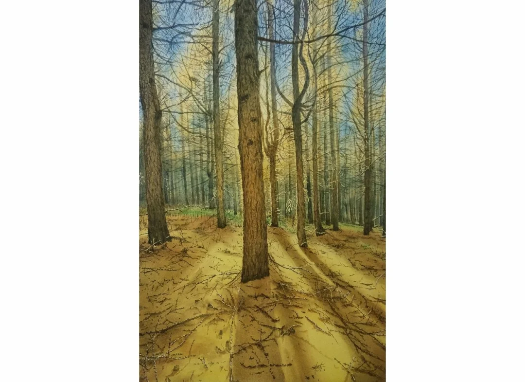 接近桦皮岭,气温越来越低,树叶也掉得越来越多,一层一层细细密密铺在地上,踩上去松松软软。失去了树叶的枝干裸露出暗黑色,阳光也显得清冷起来。树干笔直向上伸展,天空仿佛更高远了。
