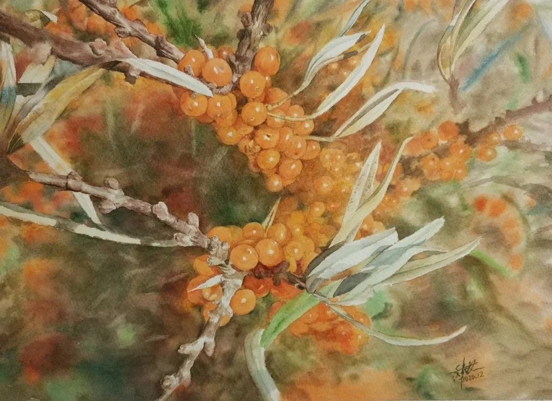 很快,发现路边原来就有一些沙棘树。沙棘灰扑扑的一丛丛,远处看起来不起眼。凑近细看,沙棘果像玛瑙一样盈润通透。沙棘上有刺,果子很小又很难拽下来,一不下心就捏爆了,很难揪下来完整的果子。弄了一手沙棘汁,好像也没吃进去什么,只够咂摸个味儿。味儿还是不错的。