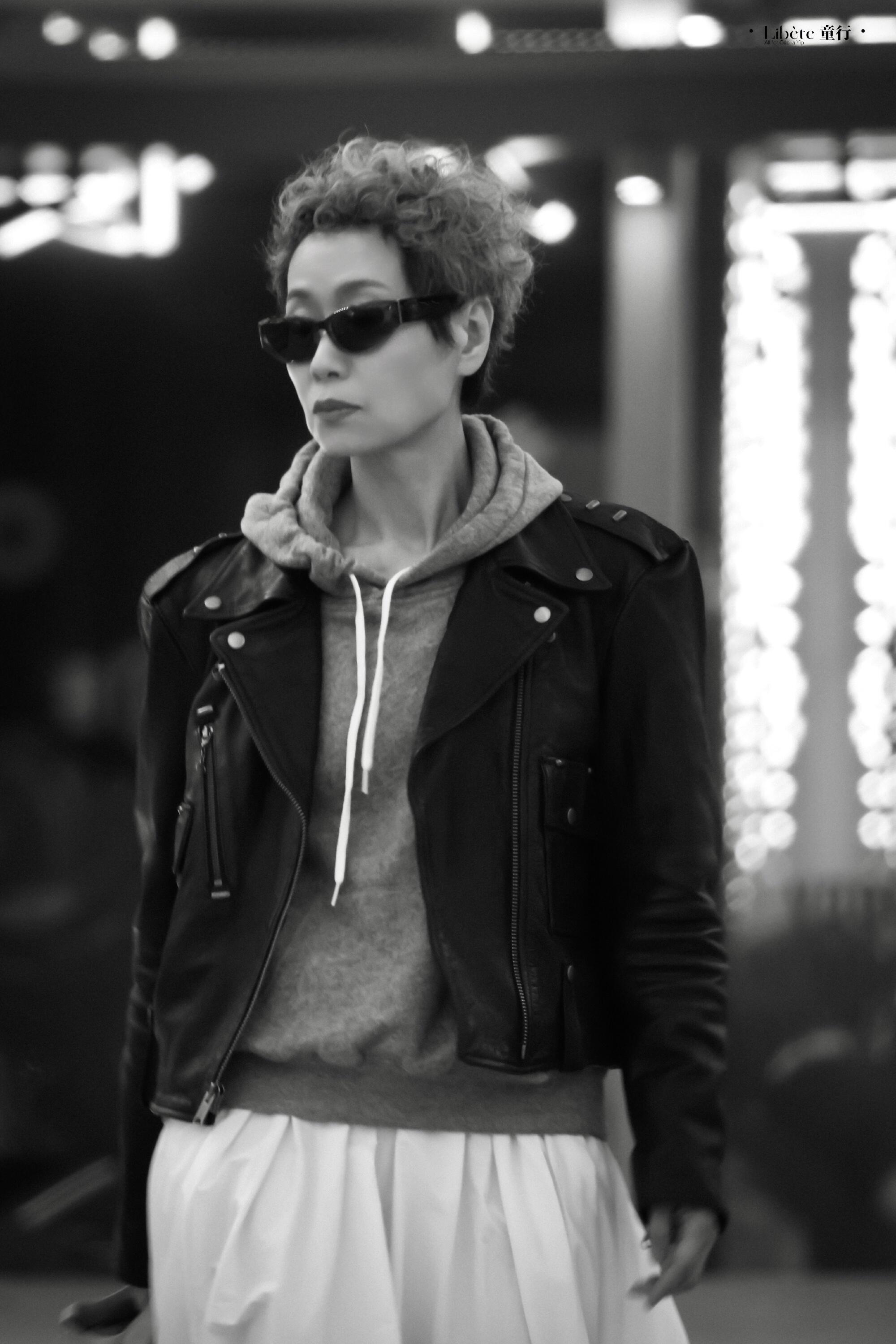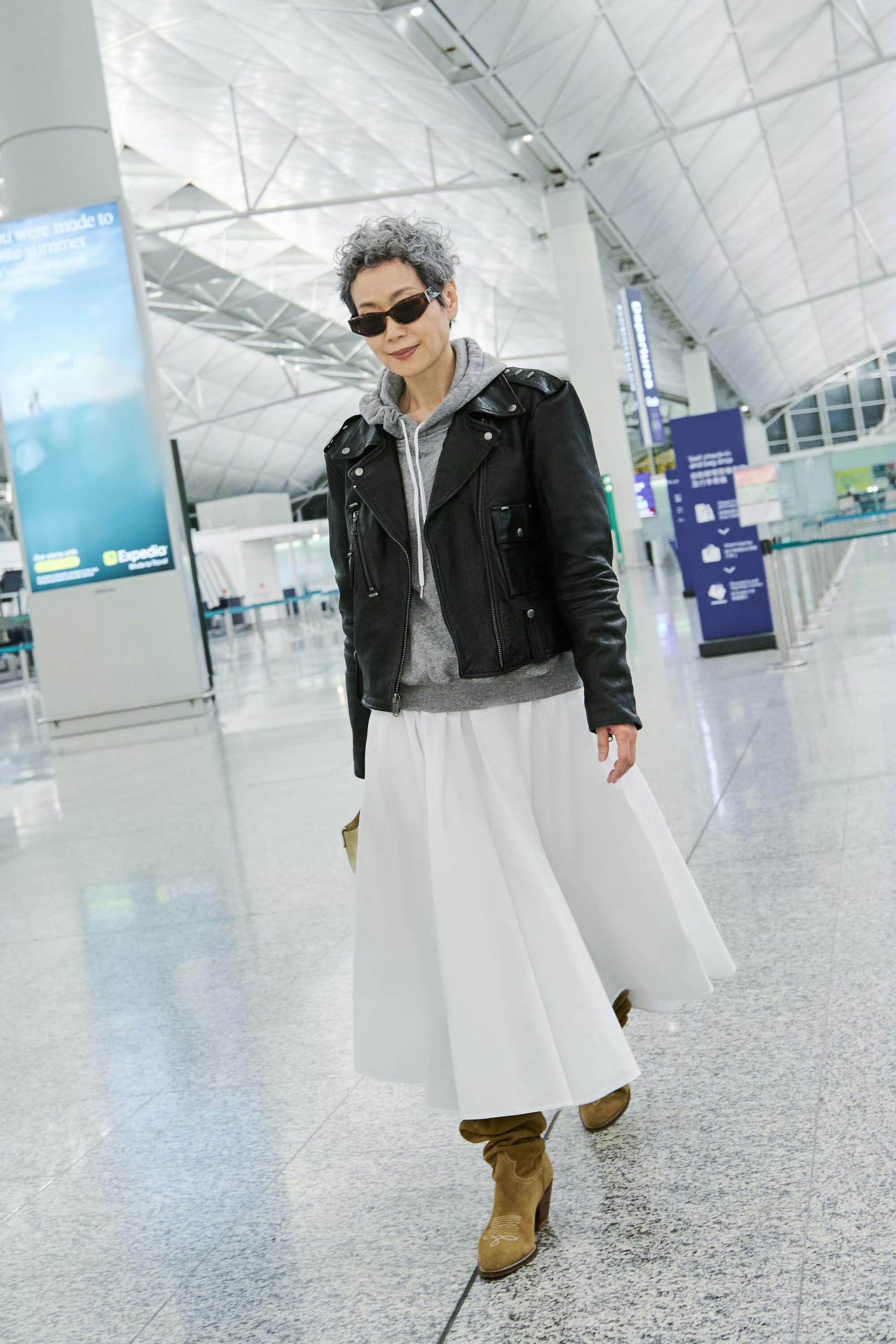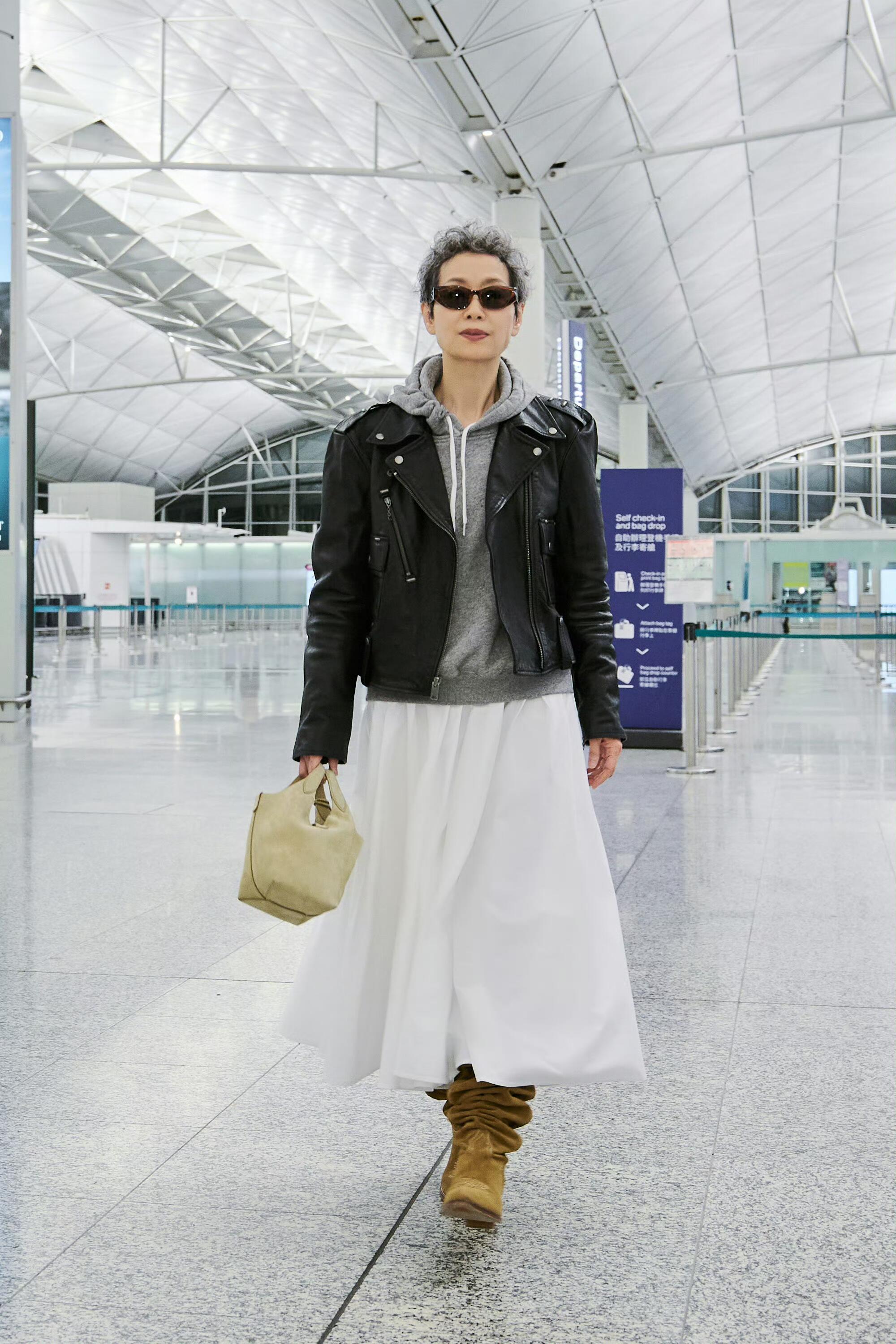 时装周纽约时装周模登日记 叶童纽约时装周出发图,黑色机车皮夹克+灰色连帽卫衣+白色半身裙,机场走出了秀场的感觉。