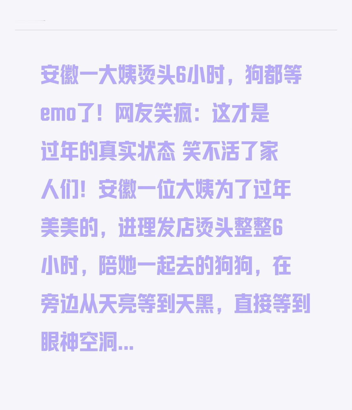 安徽一大姨烫头6小时,狗都等emo了!网友笑疯:这才是过年的真实状态 笑不活了家人们!安徽一位大姨为了过年美美的,进理发店烫头整整6小时,陪她一起去的狗狗,在旁边从天亮等到天黑,直接等到眼神空洞、生无可恋,一脸“我是谁我在哪”的emo表情,瞬间笑翻全网! 视频里,狗狗乖乖趴在理发店门口,耳朵耷拉着,眼神呆滞,一动不动像个雕塑。网友纷纷调侃:这哪是陪烫头,这是在“守活寡”!大姨变美,狗子受罪,估计狗子心里都在想:我妈到底啥时候才能回家啊! 谁能想到,一只狗狗的无奈表情,竟然戳中了亿万网友的过年共鸣。大家纷纷晒出自己的经历:陪妈妈烫头、陪爸爸理发、陪长辈做美容,一等就是大半天,从兴奋等到麻木,从期待等到崩溃,简直是全国统一过年流程。 本以为只是个搞笑段子,转折点来了:这一幕看似好笑,却藏着最温暖的人间烟火。 大姨之所以愿意花6小时烫头,不是挑剔,而是想在过年的时候,漂漂亮亮地见亲友、团圆聚会;狗狗之所以耐心守候,不是无奈,而是对主人最纯粹的陪伴与忠诚。理发店的热气、烫发水的味道、狗狗安静的等待,拼凑出最真实、最温暖的过年画面。 我们总说年味淡了,可其实年味从来都没变。它藏在长辈精心打理的发型里,藏在家人耐心的陪伴里,藏在这些琐碎又温馨的小事里。不是大鱼大肉才叫过年,不是鞭炮齐鸣才叫团圆,有人愿意为你等待,有人愿意为你变美,这就是最珍贵的幸福。 这只emo的小狗,像极了小时候陪妈妈逛街的我们;这位耐心烫头的大姨,像极了每一位热爱生活、重视仪式感的长辈。搞笑的背后,是满满的温柔与治愈。 快过年了,愿每一位长辈都能美美的过年,愿每一份陪伴都不被辜负,愿我们都能在这些细碎的温暖里,感受最浓的年味。 你过年陪长辈烫过头吗?你家宠物有过这么搞笑的瞬间吗?评论区晒出来,一起乐一乐!