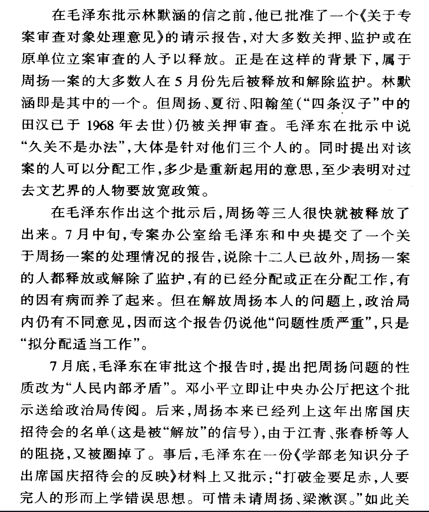 田汉死于1968年12月。 1975年夏,周扬可以放出来了。