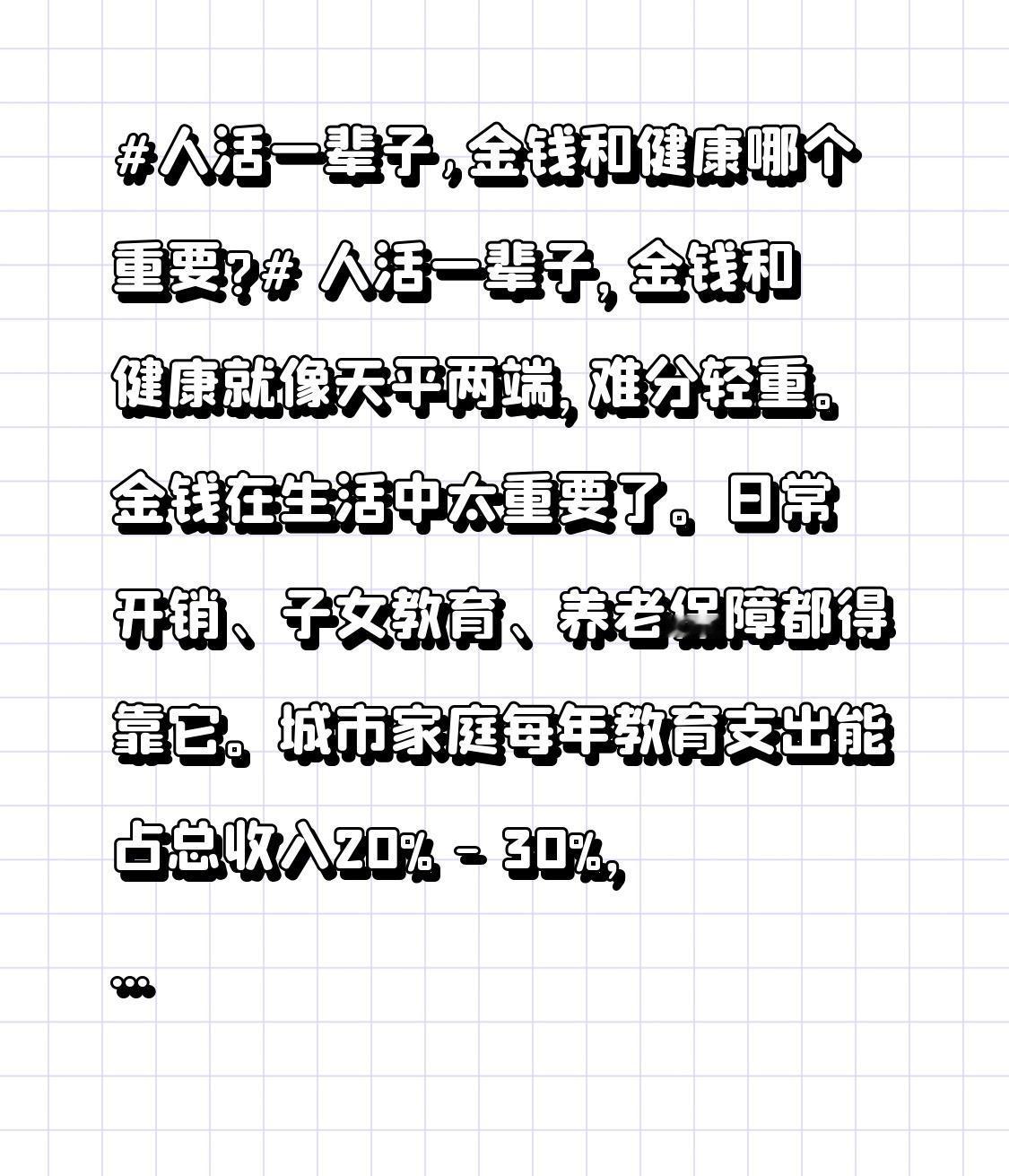 人活一辈子,金钱和健康哪个重要? 人活一辈子,金钱和健康就像天平两端,难分轻重。 金钱在生活中太重要了。日常开销、子女教育、养老保障都得靠它。城市家庭每年教育支出能占总收入20% - 30%,没钱孩子可能没好教育。遇到重大疾病,像有网友家人重病,没积蓄只能干着急。 但健康是基石,没健康,有钱也难享受生活。想象一下,每天被病痛折磨,就算有金山银山又怎样?世界卫生组织都说健康生活方式能降低疾病风险。所以啊,金钱和健康缺一不可,得尽力平衡二者。