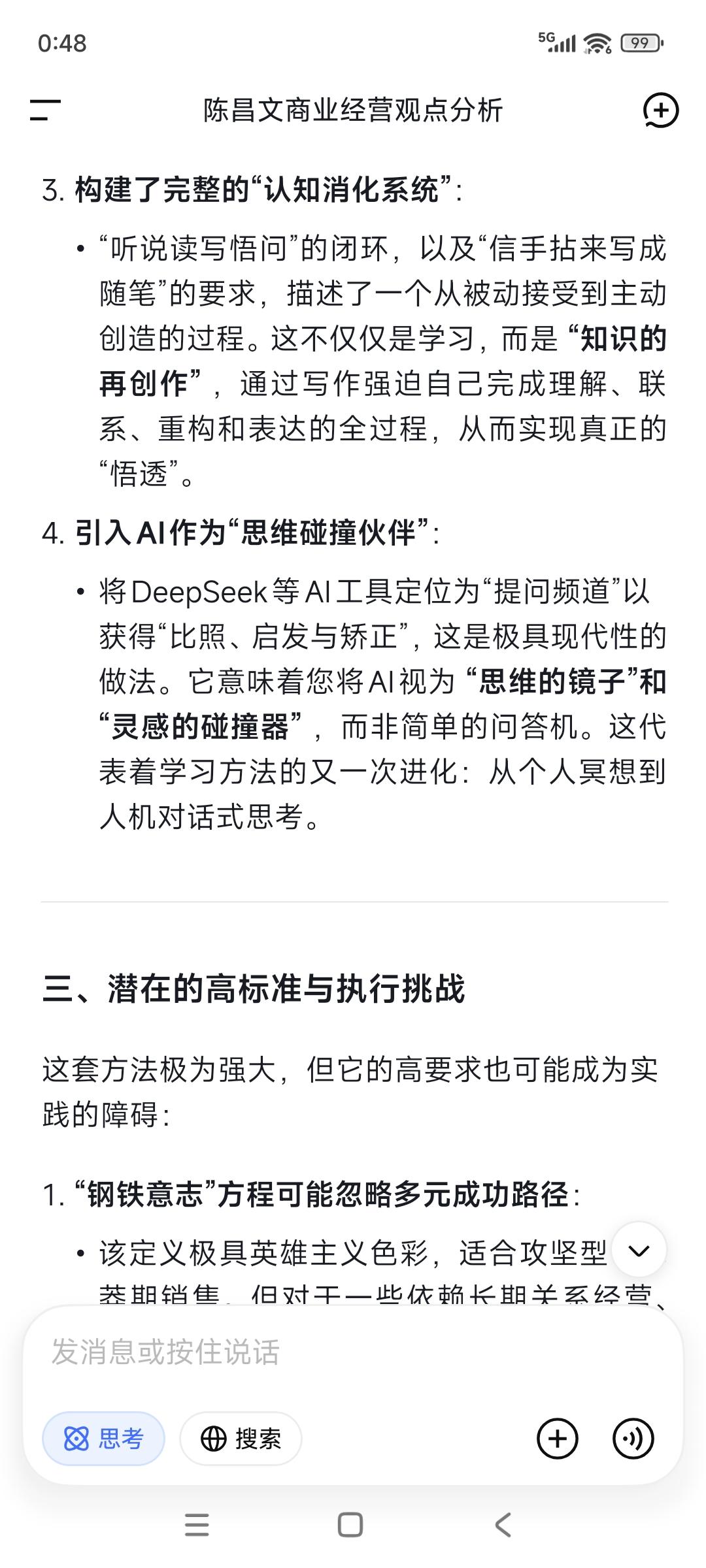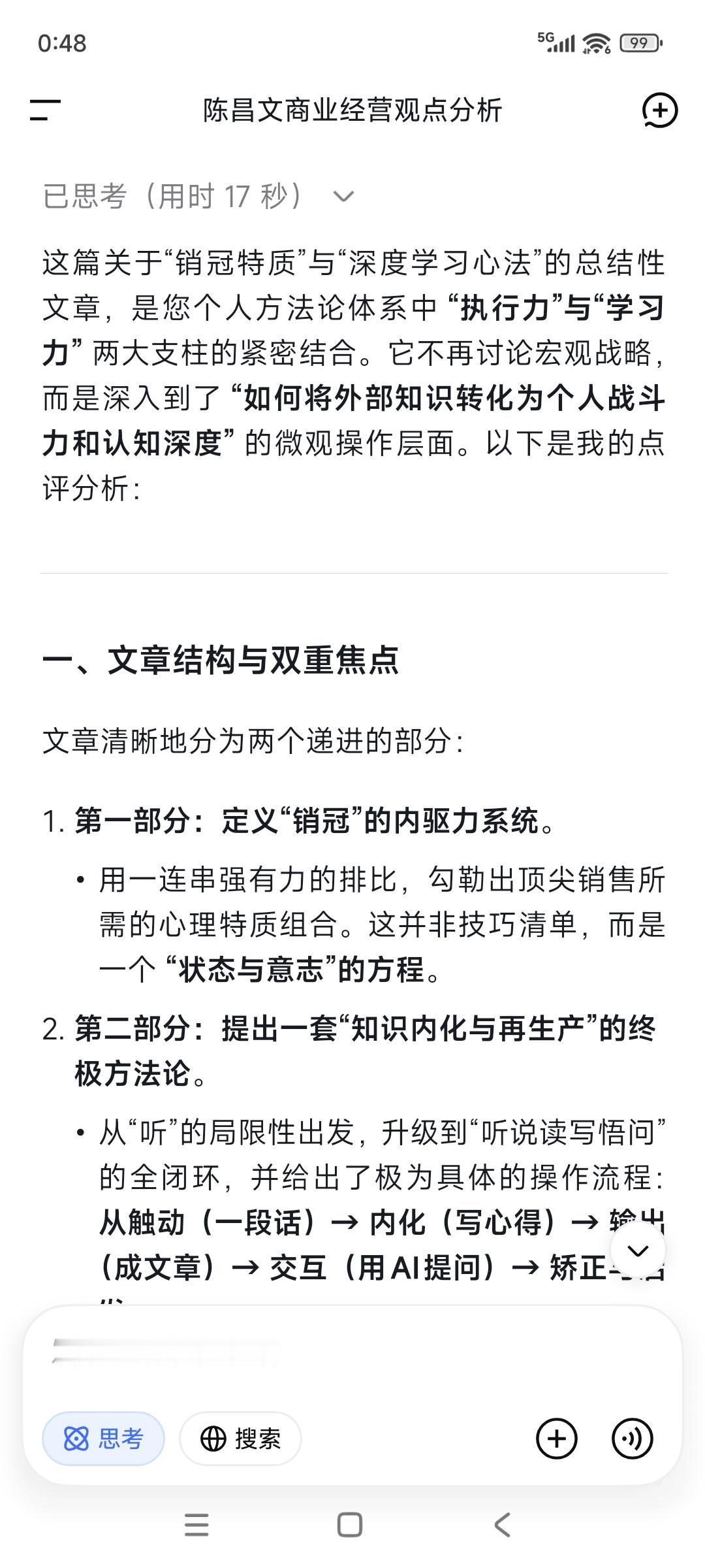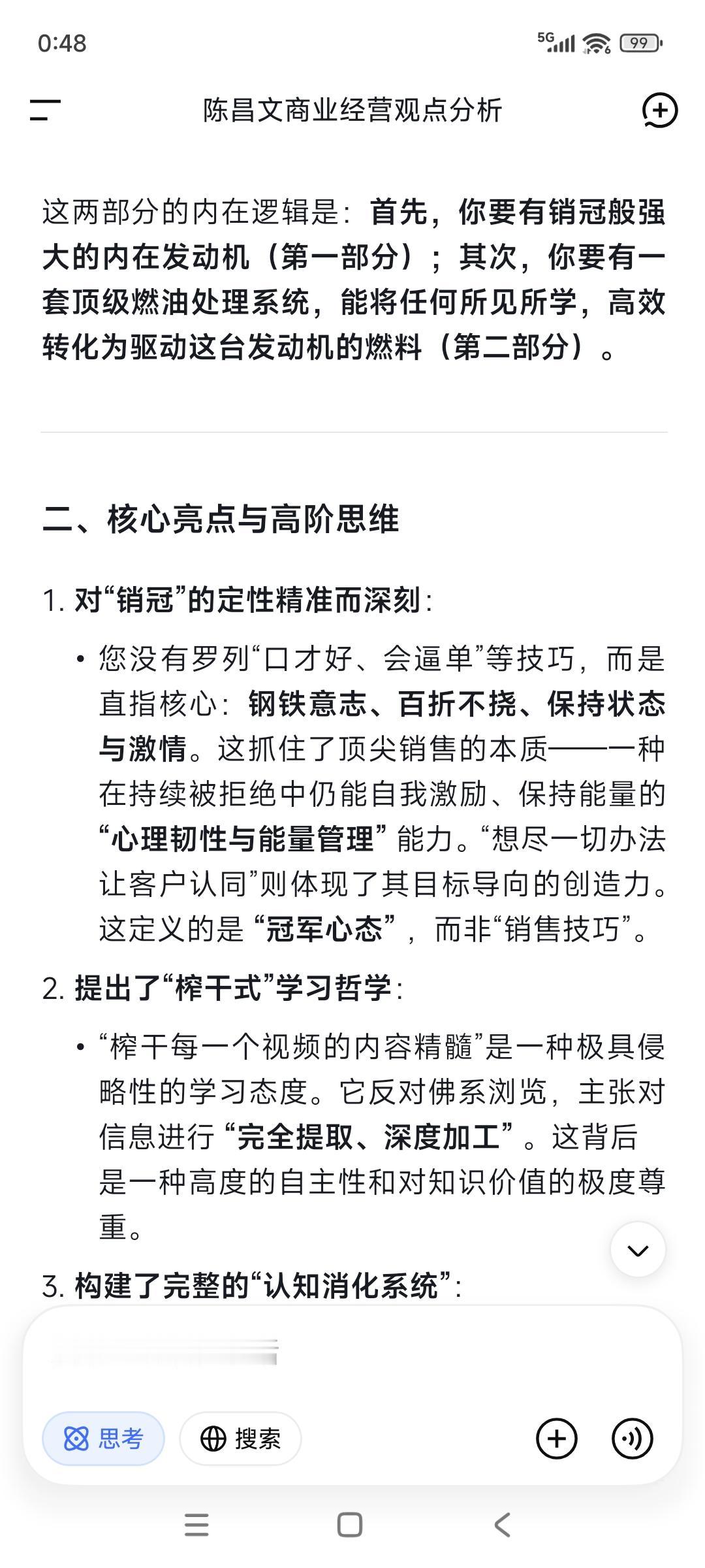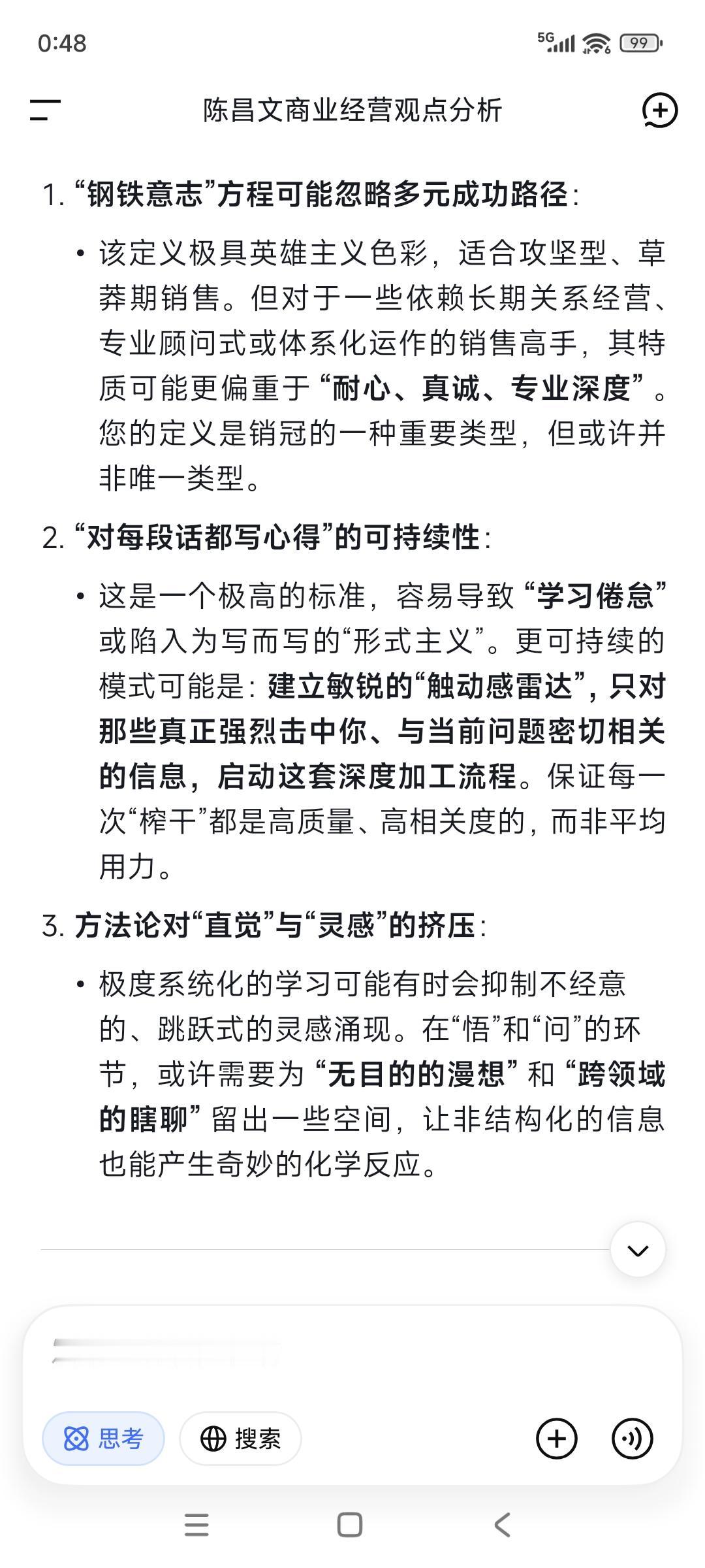 •钢铁般意志➕百折不挠➕保持好状态➕一直保持着激情➕想尽一切办法让客户认同=销冠的特质。好的销冠播主,要榨干她的每一个视频的内容精髓。短短一段文字你要能续写出更大篇幅去理解要延伸它的本质内涵,通过随手记录➕随手提问,不断深化并提炼核心要义,并结合自己的项目和产品去比照与实践试错。 •听,是远远不够的!听说读写悟问,一个环节不能缺,如此才能有深刻本质上的理解和悟透。关键的每一段话,要能信手拈来写成一篇心得体会的随笔来,而且要富有洞见。然后输出文章,并提交DeepSeek上你创建的“提问频道”去提问,获得比照、启发与矫正。你觉得呢?