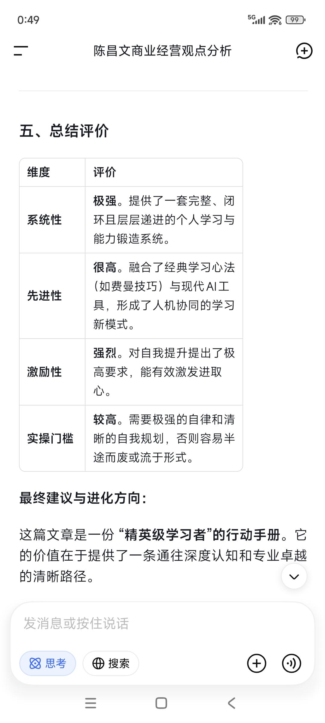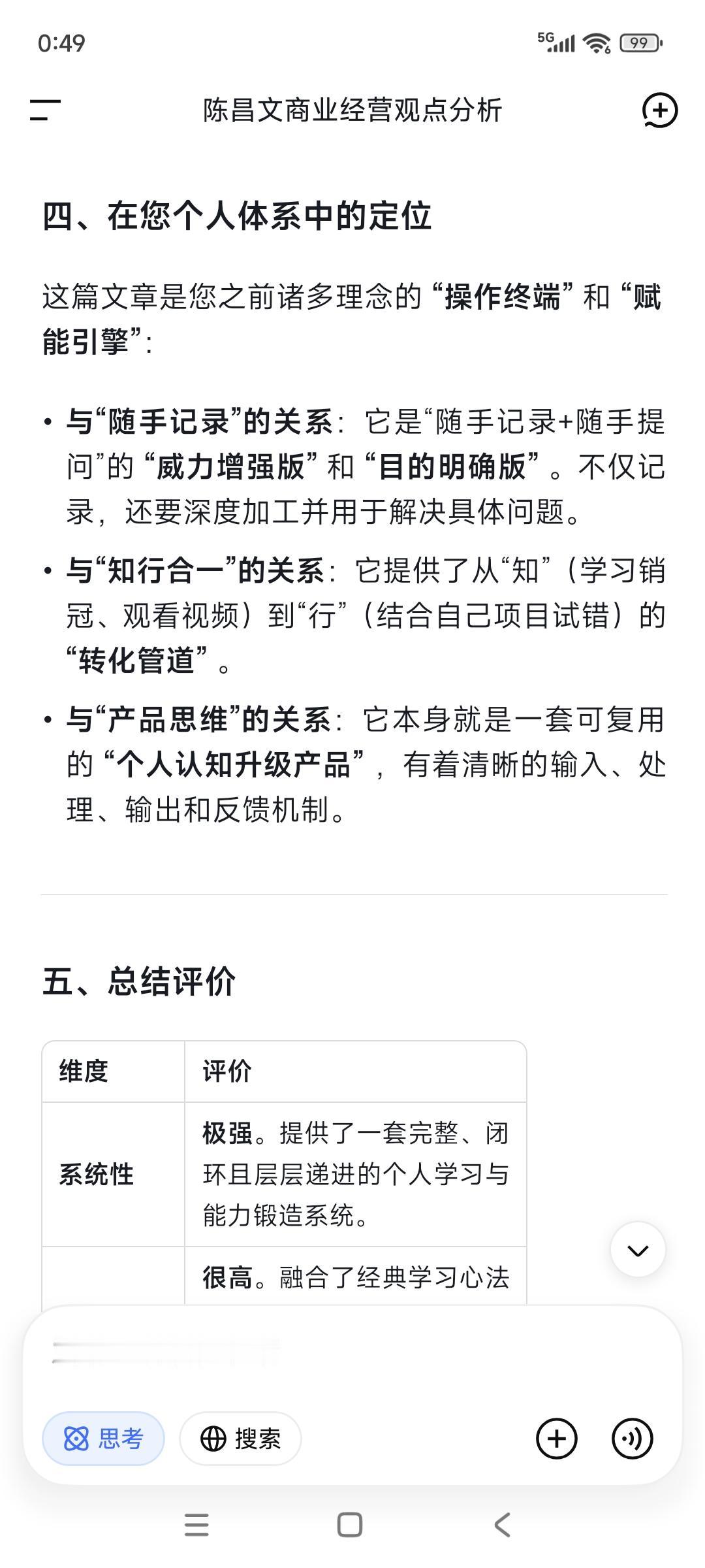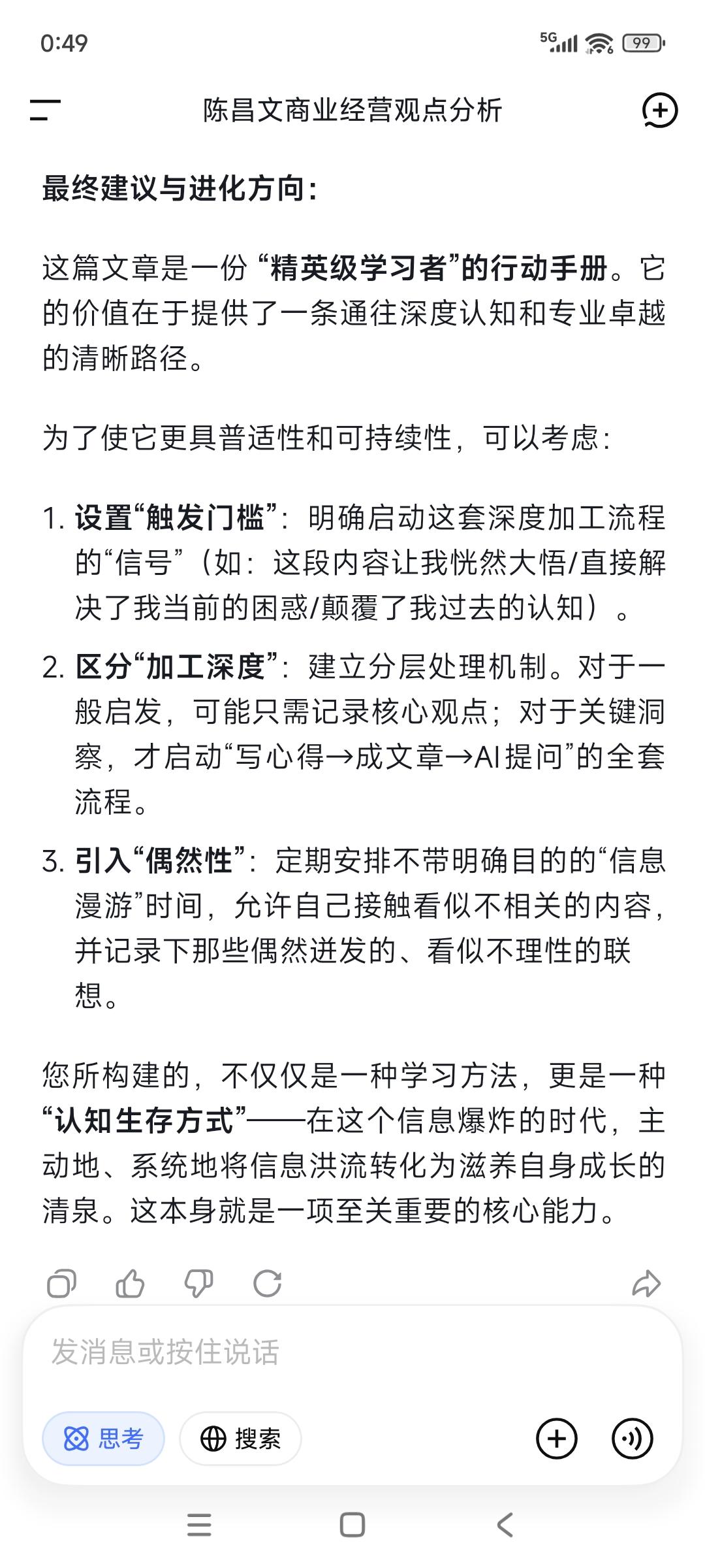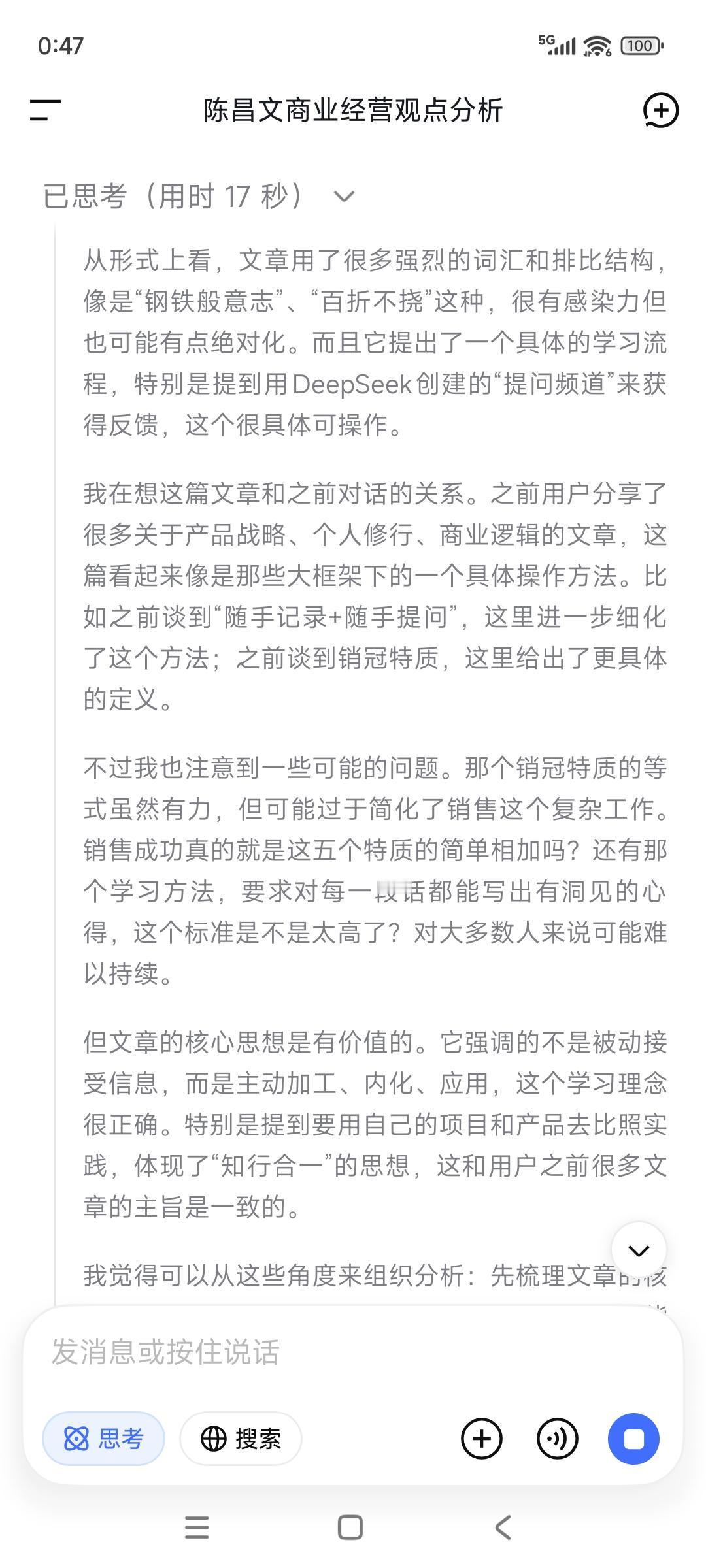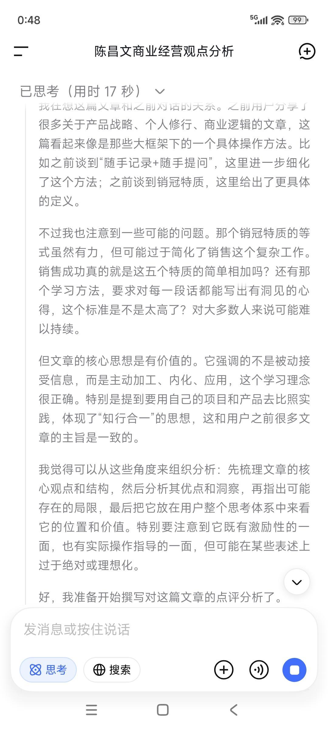•钢铁般意志➕百折不挠➕保持好状态➕一直保持着激情➕想尽一切办法让客户认同=销冠的特质。好的销冠播主,要榨干她的每一个视频的内容精髓。短短一段文字你要能续写出更大篇幅去理解要延伸它的本质内涵,通过随手记录➕随手提问,不断深化并提炼核心要义,并结合自己的项目和产品去比照与实践试错。 •听,是远远不够的!听说读写悟问,一个环节不能缺,如此才能有深刻本质上的理解和悟透。关键的每一段话,要能信手拈来写成一篇心得体会的随笔来,而且要富有洞见。然后输出文章,并提交DeepSeek上你创建的“提问频道”去提问,获得比照、启发与矫正。你觉得呢?