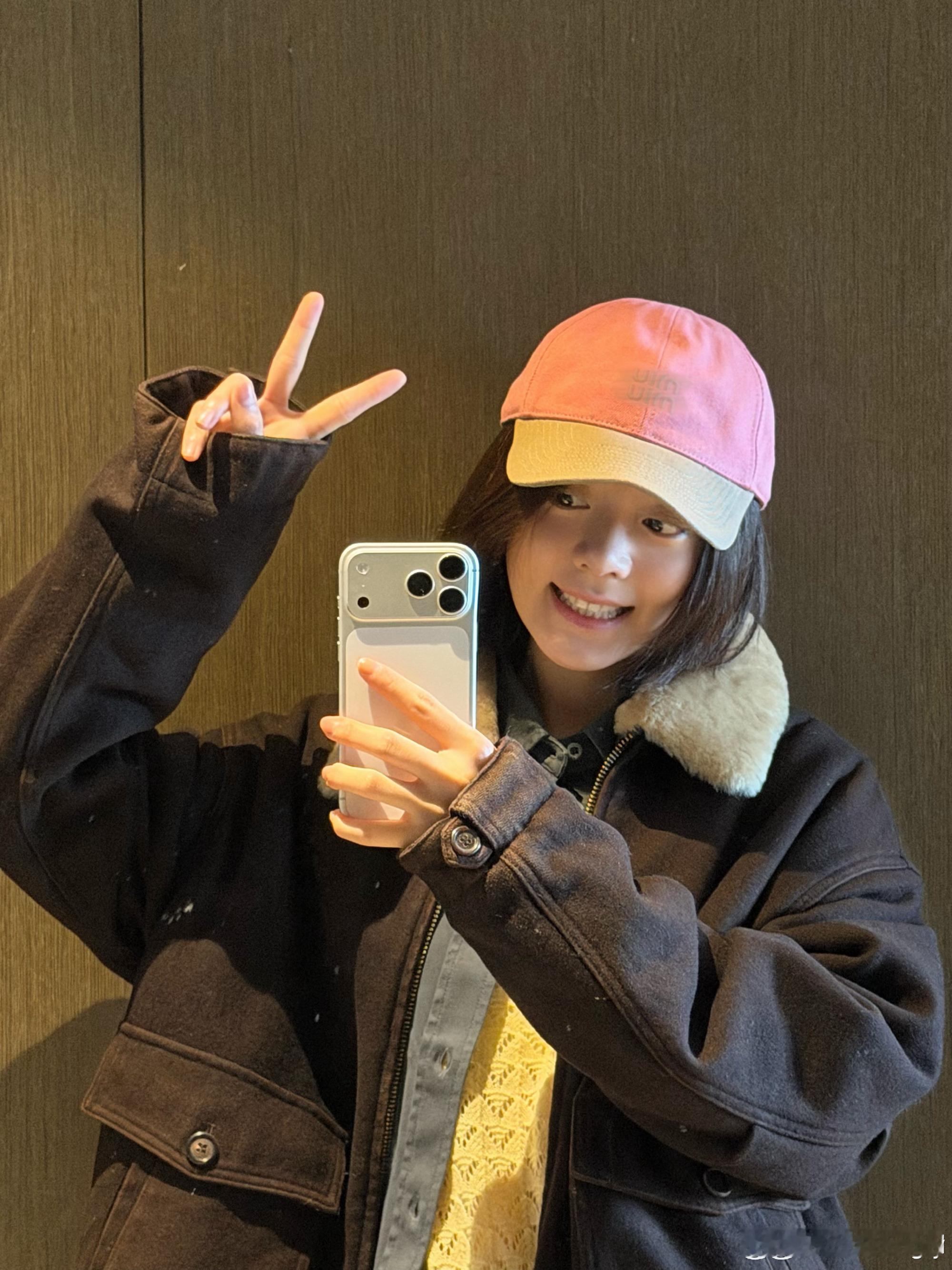 赵今麦小年营业自拍,Miu Miu品牌大使身穿 毛领夹克搭配棒球帽,是可爱又时髦