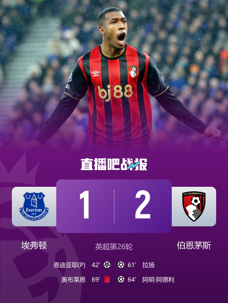 直播吧2月11日讯北京时间3:30,英超第26轮埃弗顿vs伯恩茅斯,比赛在希尔·迪金森球场打响!上半场,恩迪亚耶越位进球被判无效;拉扬送点,恩迪亚耶点射破门!下半场,拉扬将功补过头球扳平比分!奥布莱恩直红雪上加霜!最终,埃弗顿主场1-2遭伯恩茅斯逆转,英超5轮不败终结;伯恩茅斯英超6轮不败!