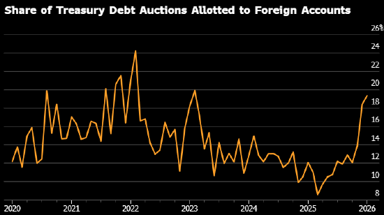 道明证券对美国财政部数据的分析显示,1月份,外国及国际账户在美国国债拍卖中的获配比例约19%,创近三年来最高水平。过去五年中,这一比例曾在2022年初一度高达近25%,此后在2024年11月降至不足10%。