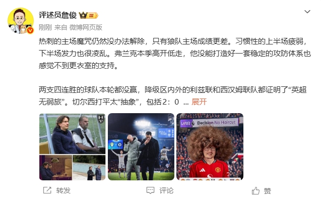 直播吧02月11日讯本轮英超结束多场对阵,曼联1-1西汉姆,切尔西2-2利兹联,热刺1-2纽卡。赛后评述员詹俊发文。