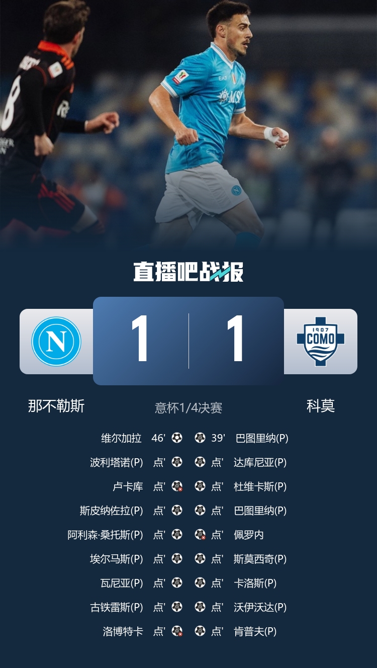 卢卡库失点!那不勒斯点球大战6-7总比分7-8科莫无缘意杯半决赛
