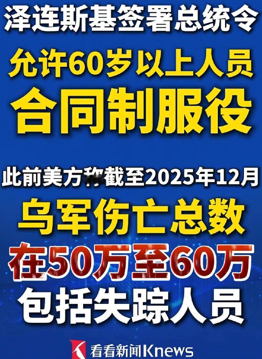 泽连斯基签署总统令,允许60岁以上老人合同制服役!先别喷!不是强制征兵!允许!老人志愿或自愿!签合同,打仗时有工资待遇,一年或二年,短期兼职,退役还享有退役军人待遇!前几天泽连斯基刚曝光,乌克兰阵亡5.5万人,现在又征召老年人上战场,可见兵源确实短缺,可是乌克兰保家卫国乌克兰人很爱国!