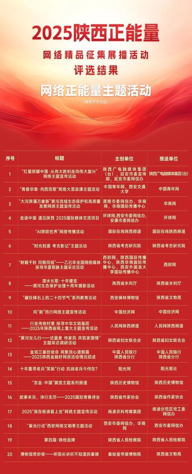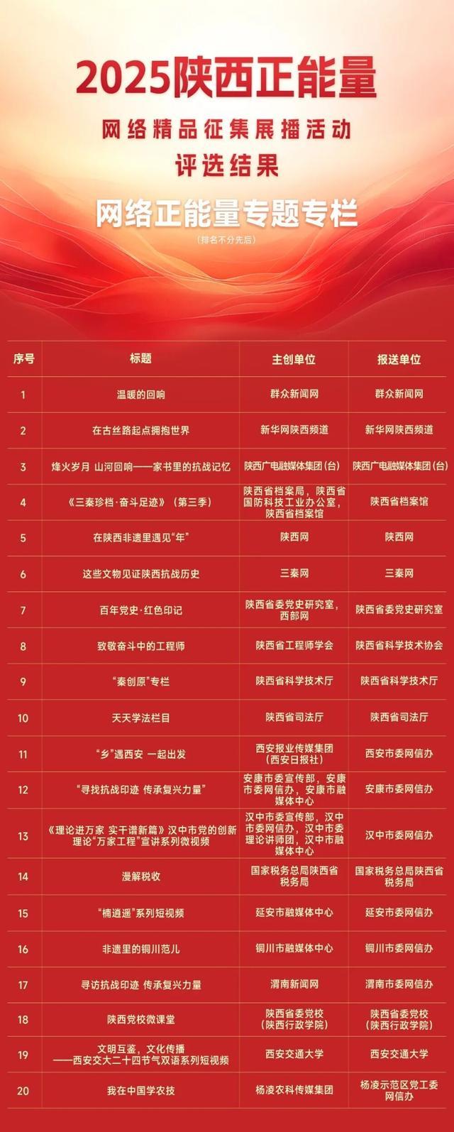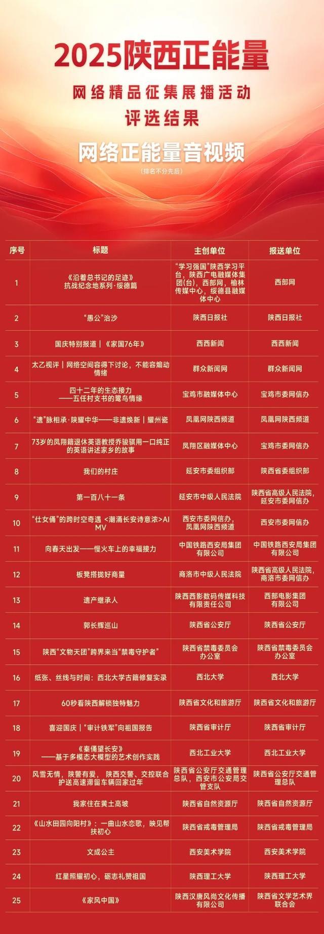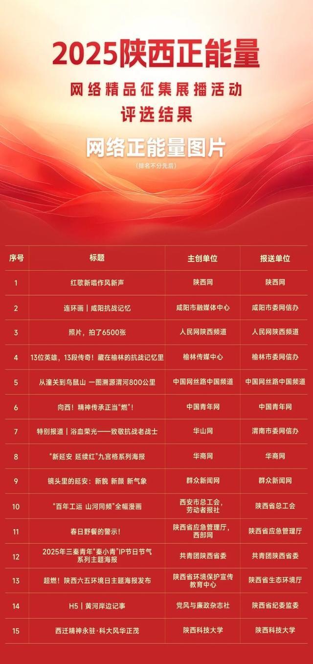 2月10日,由陕西省委网信办主办的2025陕西正能量网络精品展示活动结果正式揭晓。活动经作品征集、评审、公示等环节,评选出了100件网民认可、社会认同、影响广泛的网络精品。