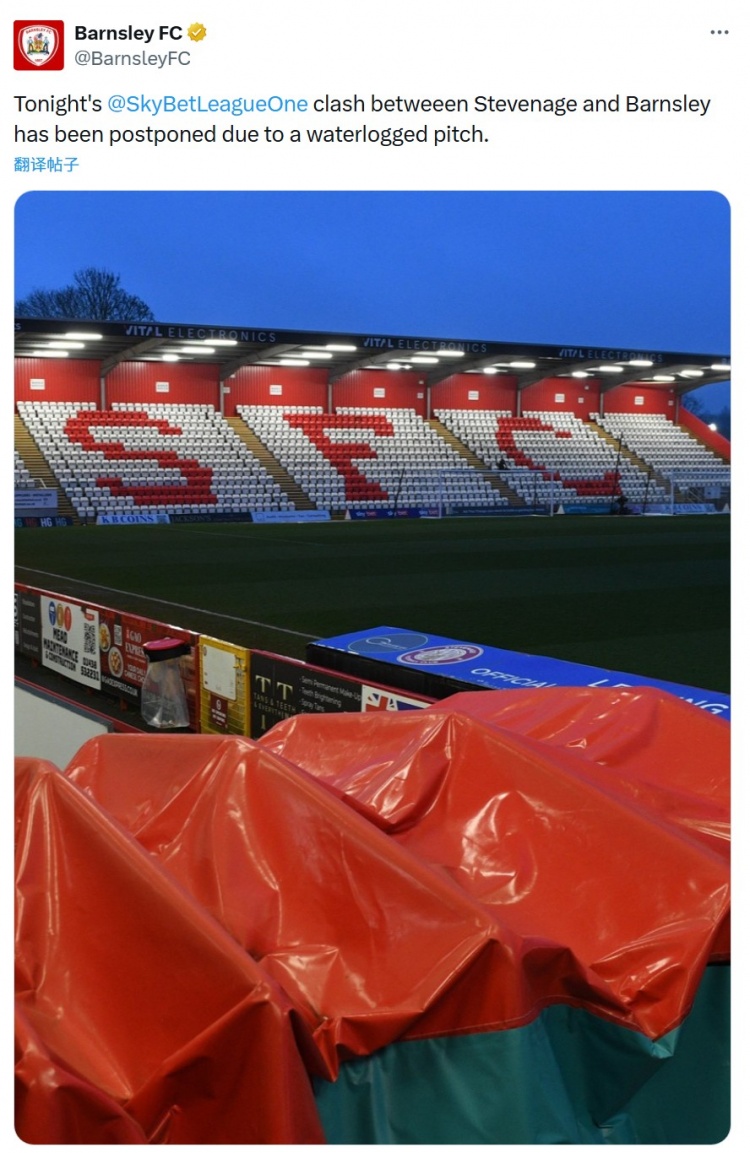 直播吧2月11日讯巴恩斯利官方确认,客场对阵斯蒂文尼奇的比赛因场地积水延期。