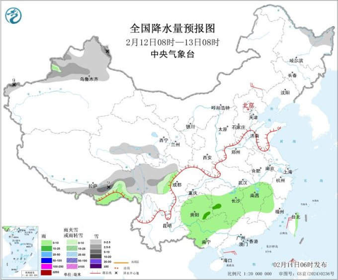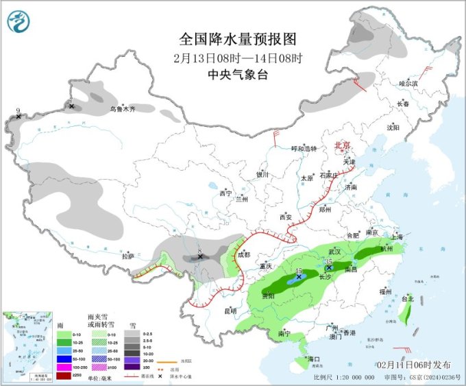 气象监测显示,昨日(2月10日),我国降水天气主要分布在南方地区,西南地区东部、江南、华南西部等地部分地区出现小雨,局地中雨;西藏东部、吉林东部、辽宁东部等地部分地区出现小雪或雨夹雪,局地中雪。