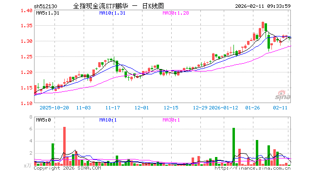 全指现金流ETF鹏华(512130)业绩比较基准为中证全指自由现金流指数收益率,管理人为鹏华基金管理有限公司,基金经理为寇斌权,成立(2025-06-05)以来回报为31.04%,近一个月回报为4.71%。