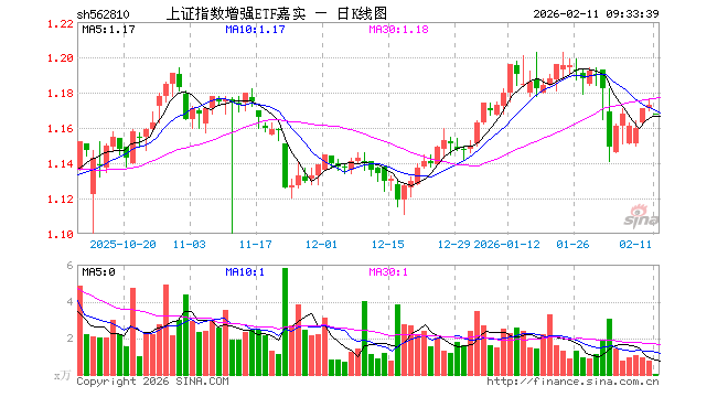 2月11日,上证指数增强ETF嘉实(562810)开盘跌0.43%,报1.168元。上证指数增强ETF嘉实(562810)重仓股方面,中国石油开盘涨0.09%,工商银行涨0.27%,农业银行涨0.00%,贵州茅台涨0.00%,工业富联跌0.84%,紫金矿业跌0.54%,中国人寿涨0.02%,中国银行涨0.00%,中国电信涨0.00%,招商银行涨0.05%。
