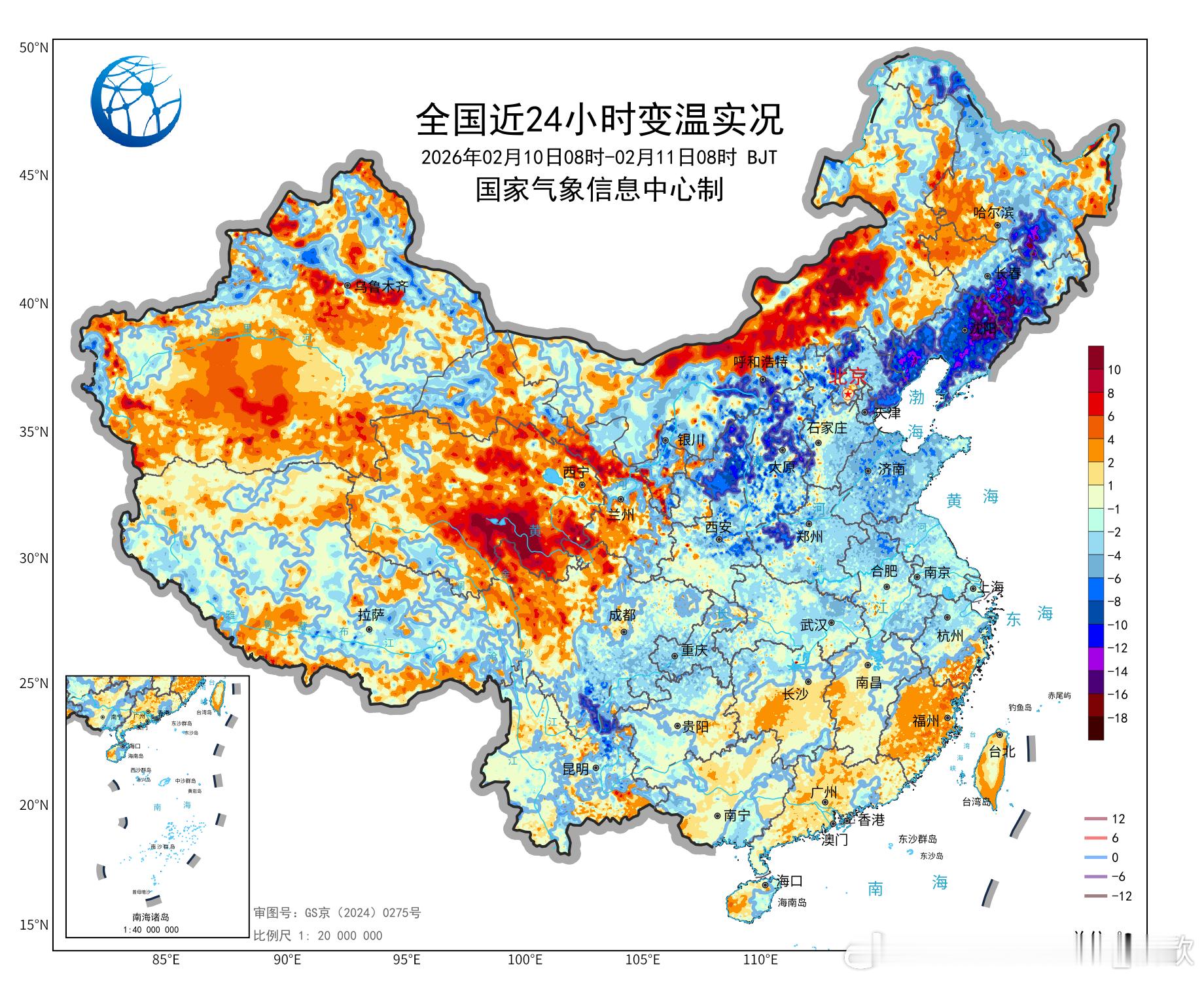 今天白天因为有光照加热,抵消了冷空气降温,因此最高气温的对比,东北变化不明显,辽宁甚至还有点小升温。而今天升温明显的区域,一个是内蒙古中部,因为昨天冷空气降温明显,今天冷空气过后,回升也明显。另外就是湖北湖南江西交界一带,今天放晴,光照加热利于升温。