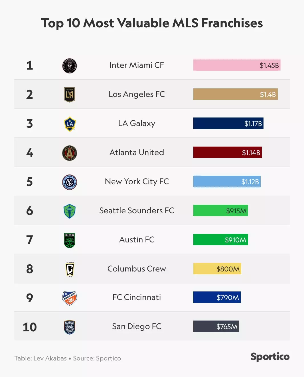 这家佛罗里达州的实体在短短一年内增长22%后领跑榜单,这是整个联盟中最大的增幅,并且首次超越洛杉矶FC——后者曾在美国媒体发布的前几份报告中估值领先。洛杉矶FC以14亿美元的估值紧随其后,增长率为9%。